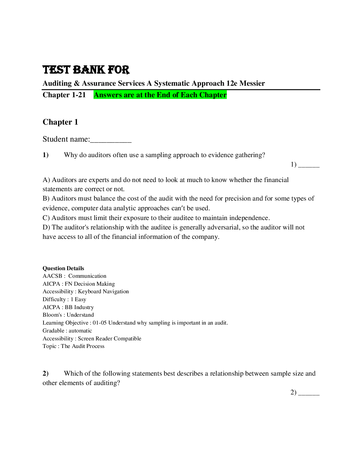 Test Bank for Auditing & Assurance Services: A Systematic Approach, 12th Edition by Messier, Glover, and Prawitt. Test Bank for Auditing & Assurance Services: A Systematic Approach, 12th Edition by Messier, Glover, and Prawitt TEST BANKS