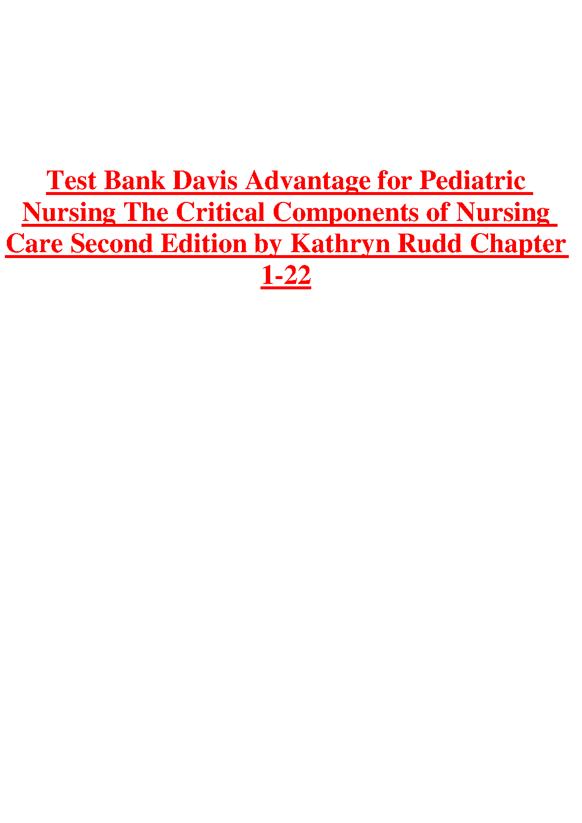 Test Bank: Davis Advantage for Pediatric Nursing - The Critical Components of Nursing Care, 2nd Edition by Kathryn Rudd. Test Bank: Davis Advantage for Pediatric Nursing - The Critical Components of Nursing Care, 2nd Edition by Kathryn Rudd TEST BANKS