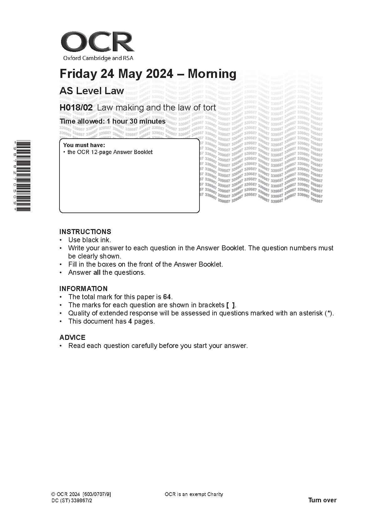 OCR AS LEVEL LAW QUESTION PAPER 2 2024(H018/02:LAW MAKING AND THE LAW OF TORT). OCR AS LEVEL LAW QUESTION PAPER 2 2024(H018/02:LAW MAKING AND THE LAW OF TORT) OCR GCE A & AS LEVEL Papers and Mark Schemes