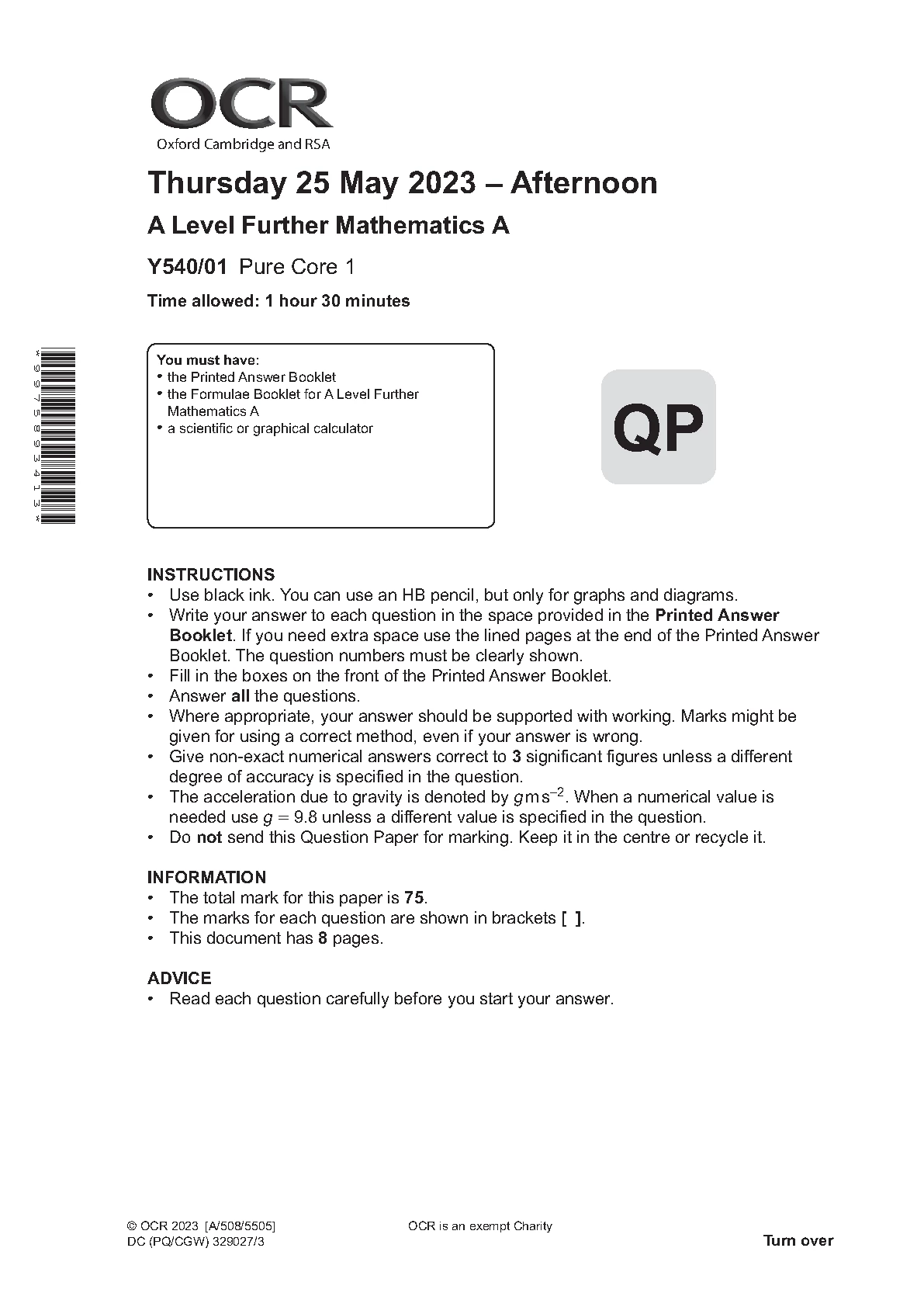 ocr gce a level further mathematics a paper 1 question paper 2023 (y540/01: pure core 1). download official and verified...