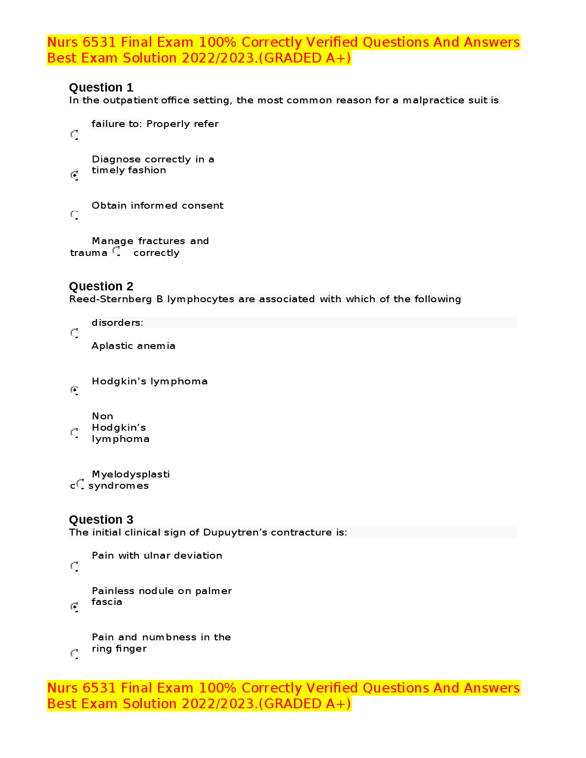 Nurs 6531 Final Exam: 100% Correctly Verified Questions and Answers (2024/2025 Edition). Nurs 6531 Final Exam: 100% Correctly Verified Questions and Answers (2024/2025 Edition) TEST BANKS