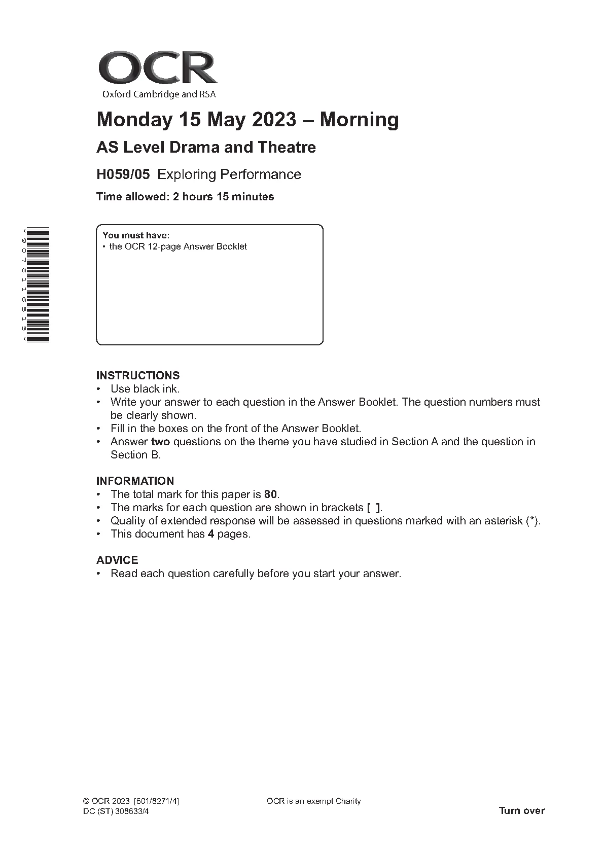 OCR GCE AS LEVEL DRAMA AND THEATRE PAPER 5 QUESTION PAPER 2023 (H059/05: Exploring Performance). OCR GCE AS LEVEL DRAMA AND THEATRE PAPER 5 QUESTION PAPER 2023 (H059/05: Exploring Performance) OCR GCE A & AS LEVEL Papers and Mark Schemes
