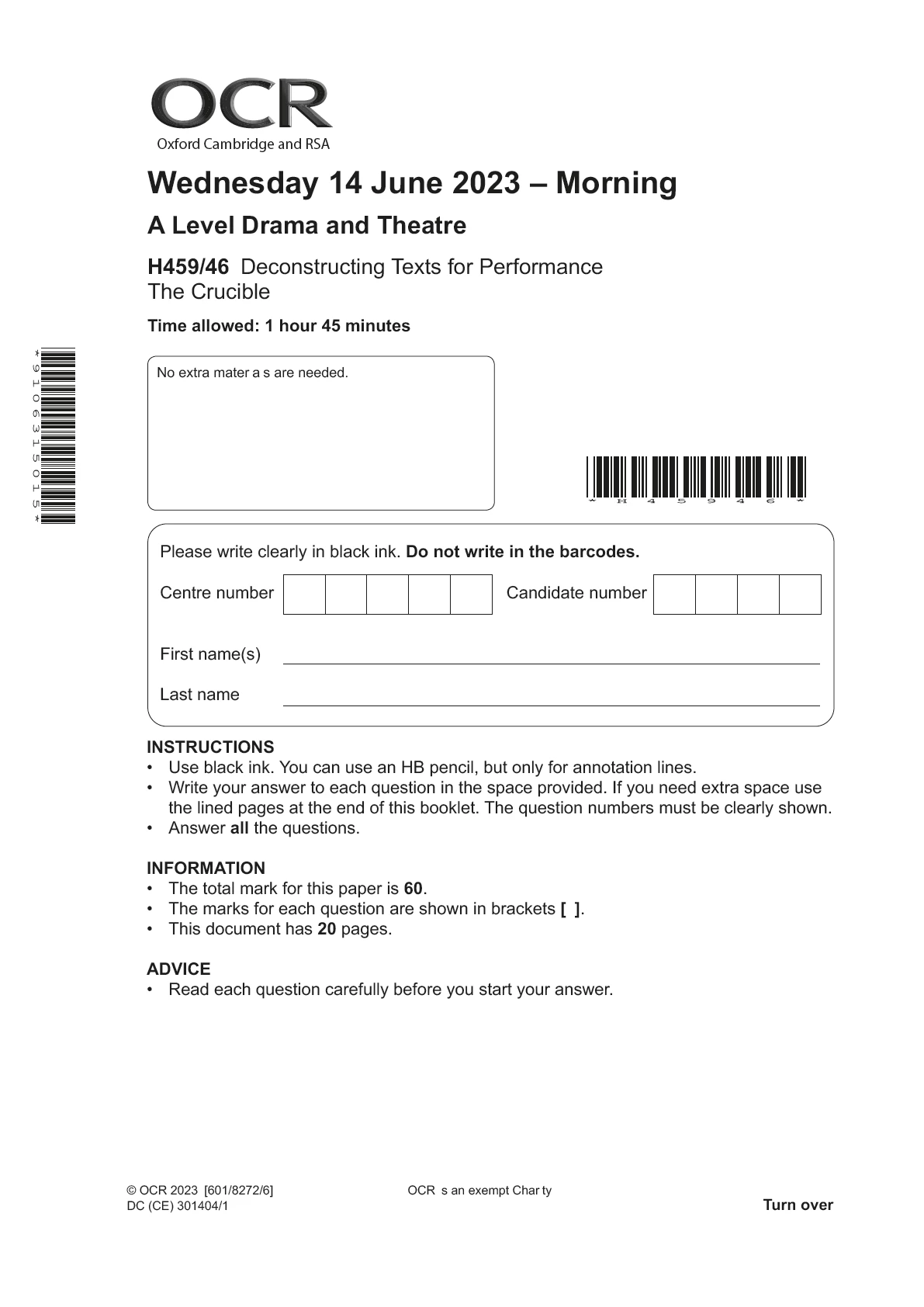 OCR GCE A LEVEL DRAMA AND THEATRE PAPER 4 QUESTION PAPER 2023 (H459/46: Deconstructing texts for performance: The Crucible). OCR GCE A LEVEL DRAMA AND THEATRE PAPER 4 QUESTION PAPER 2023 (H459/46: Deconstructing texts for performance: The Crucible) OCR GCE A & AS LEVEL Papers and Mark Schemes