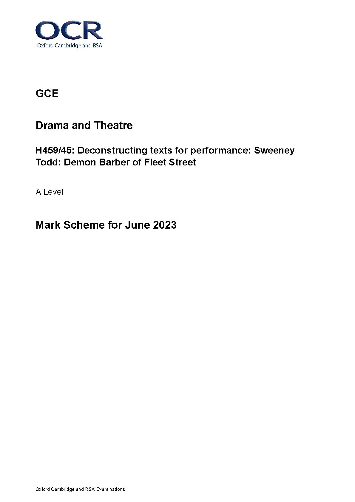 OCR GCE A LEVEL DRAMA AND THEATRE PAPER 4 MARK SCHEME 2023 (H459/45: Deconstructing Texts for Performance Sweeney Todd). OCR GCE A LEVEL DRAMA AND THEATRE PAPER 4 MARK SCHEME 2023 (H459/45: Deconstructing Texts for Performance Sweeney Todd) OCR GCE A & AS LEVEL Papers and Mark Schemes