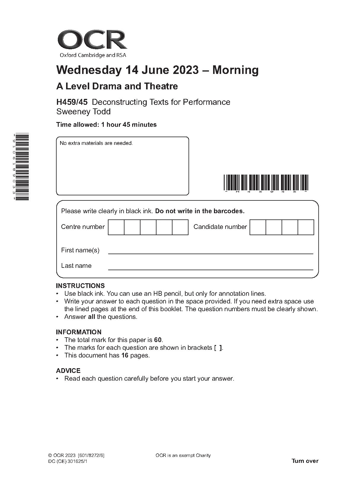 OCR GCE A LEVEL DRAMA AND THEATRE PAPER 4 QUESTION PAPER 2023 (H459/45: Deconstructing Texts for Performance Sweeney Todd). OCR GCE A LEVEL DRAMA AND THEATRE PAPER 4 QUESTION PAPER 2023 (H459/45: Deconstructing Texts for Performance Sweeney Todd) OCR GCE A & AS LEVEL Papers and Mark Schemes