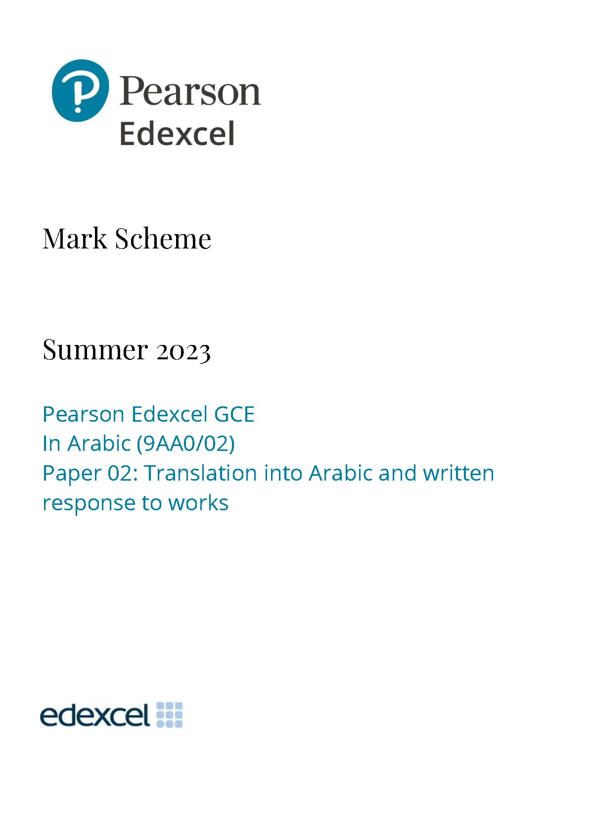 PEARSON EDEXCEL A LEVEL Arabic PAPER 2 2023 MARK SCHEME (9AA0/02: Translation into Arabic and written response to works). PEARSON EDEXCEL A LEVEL Arabic PAPER 2 2023 MARK SCHEME (9AA0/02: Translation into Arabic and written response to works) Pearson Edexcel A and AS Papers and Mark Schemes