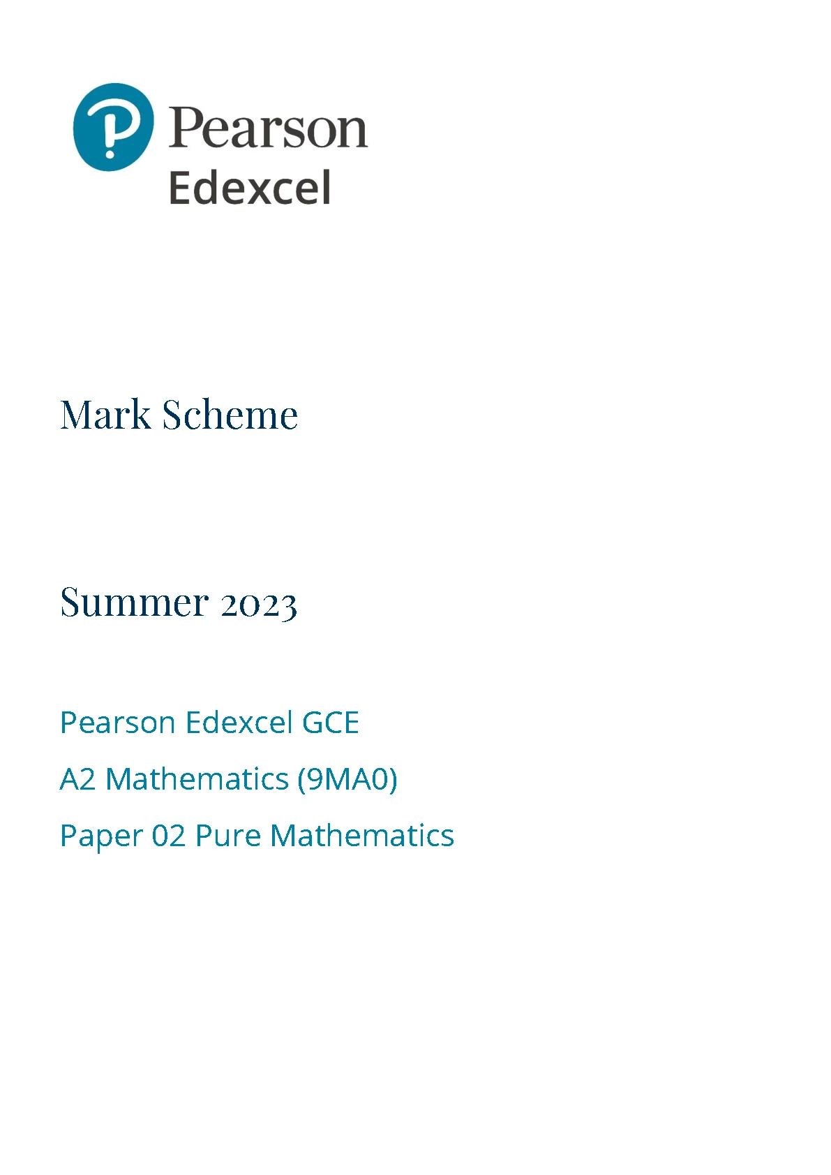 PEARSON EDEXCEL A LEVEL Mathematics PAPER 2 2023 MARK SCHEME (9MA0/02: Pure Mathematics). PEARSON EDEXCEL A LEVEL Mathematics PAPER 2 2023 MARK SCHEME (9MA0/02: Pure Mathematics) Pearson Edexcel A and AS Papers and Mark Schemes