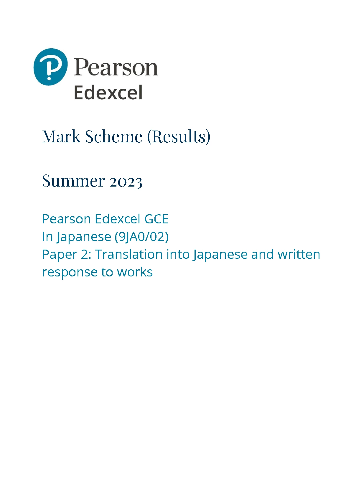 PEARSON EDEXCEL A LEVEL Japanese PAPER 2 2023 MARK SCHEME (9JA0/02: Translation into Japanese and written response to works). PEARSON EDEXCEL A LEVEL Japanese PAPER 2 2023 MARK SCHEME (9JA0/02: Translation into Japanese and written response to works) Pearson Edexcel A and AS Papers and Mark Schemes