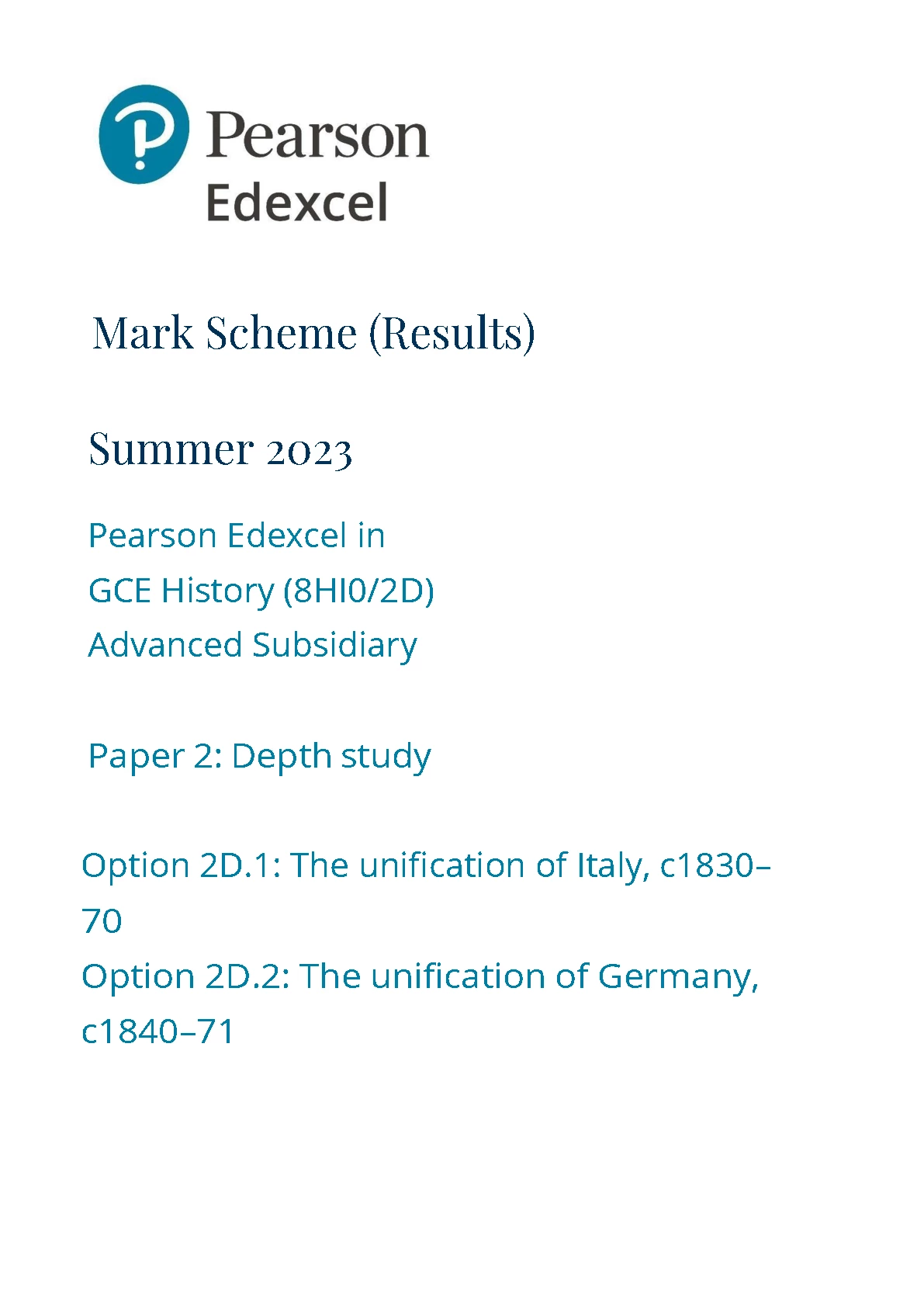 PEARSON EDEXCEL AS LEVEL History PAPER 2 2023 MARK SCHEME (8HI0/2D: Option 2D.1: The unification of Italy, c1830–70 & Option 2D.2: The unification of Germany,c1840–71).. PEARSON EDEXCEL AS LEVEL History PAPER 2 2023 MARK SCHEME (8HI0/2D: Option 2D.1: The unification of Italy, c1830–70 & Option 2D.2: The unification of Germany,c1840–71). Pearson Edexcel A and AS Papers and Mark Schemes