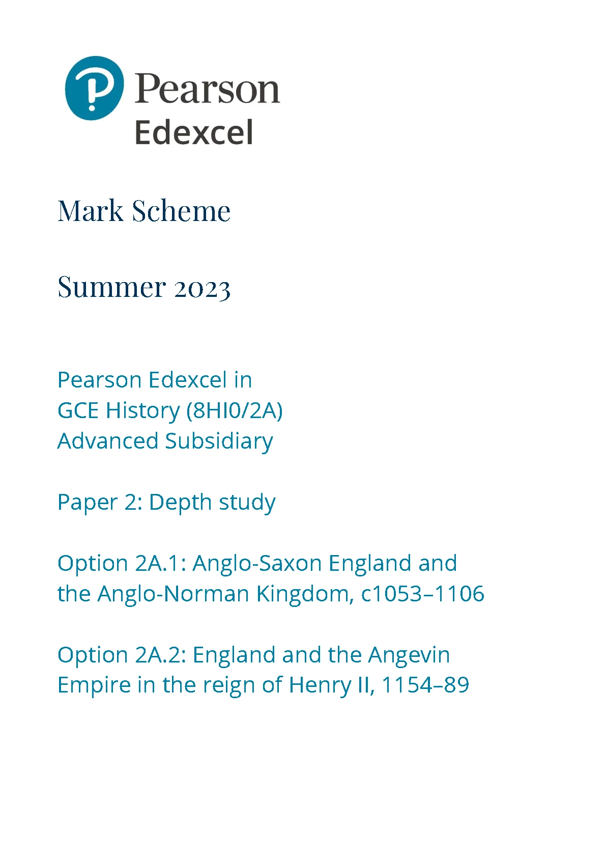 PEARSON EDEXCEL AS LEVEL History PAPER 2 2023 MARK SCHEME (8HI0/2A:Option 2A.1: Anglo-Saxon England and the Anglo-Norman Kingdom, c1053–1106 & Option 2A.2: England and the Angevin Empire in the reign of Henry II, 1154–89). PEARSON EDEXCEL AS LEVEL History PAPER 2 2023 MARK SCHEME (8HI0/2A:Option 2A.1: Anglo-Saxon England and the Anglo-Norman Kingdom, c1053–1106 & Option 2A.2: England and the Angevin Empire in the reign of Henry II, 1154–89) Pearson Edexcel A and AS Papers and Mark Schemes