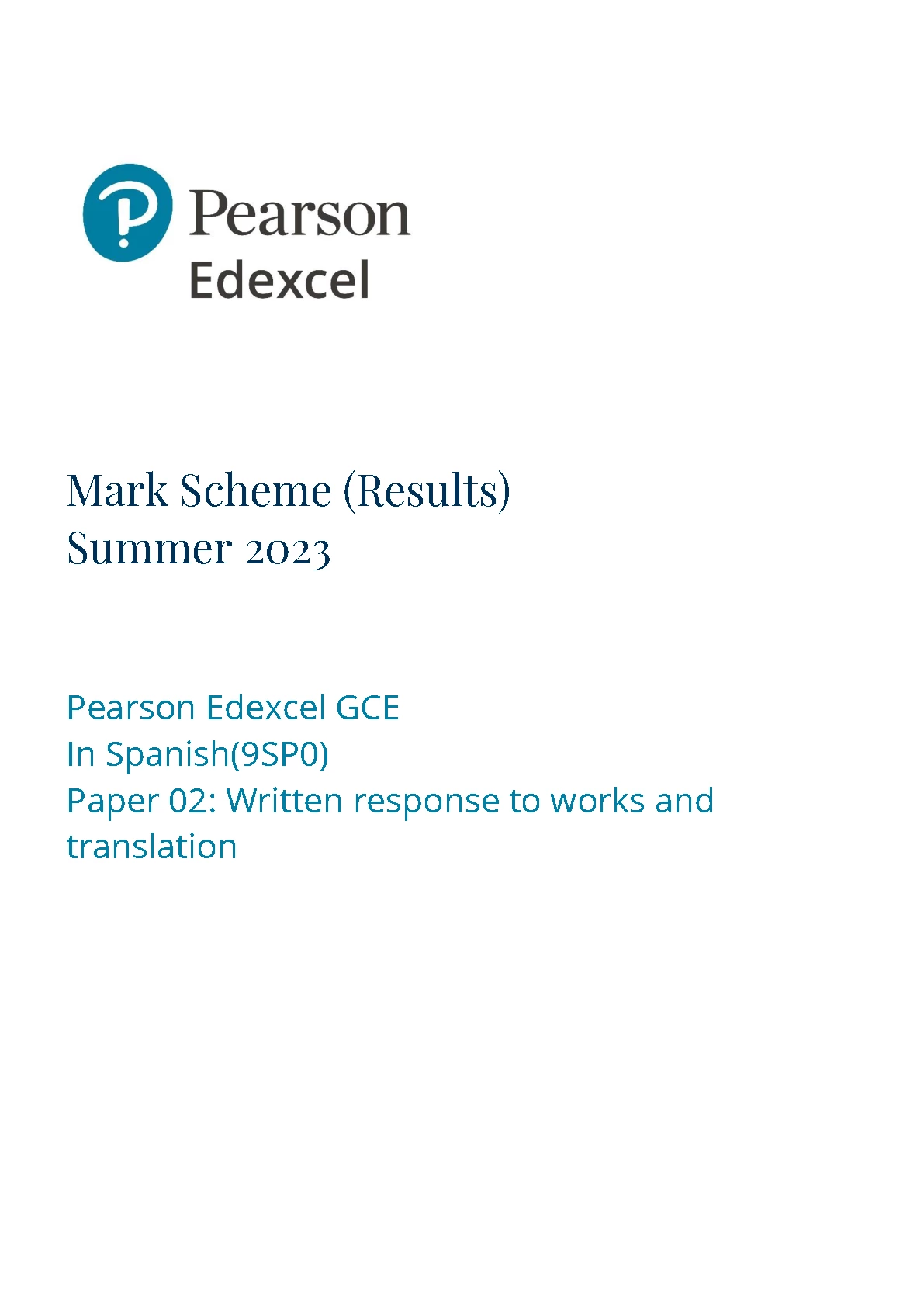 pearson edexcel a level spanish paper 2 2023 mark scheme (9sp0/02: written response to works and translation). download...