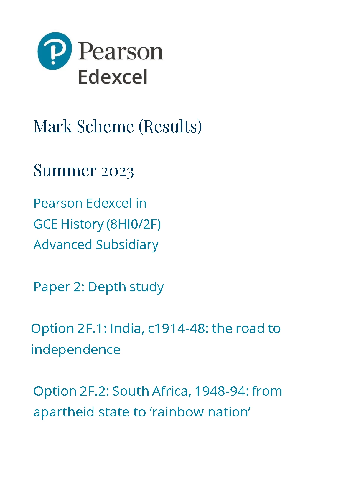 PEARSON EDEXCEL AS LEVEL History PAPER 2 2023 MARK SCHEME (8HI0/2F: Option 2F.1: India, c1914-48: the road to independence & Option 2F.2: South Africa, 1948-94: from apartheid state to ‘rainbow nation’). PEARSON EDEXCEL AS LEVEL History PAPER 2 2023 MARK SCHEME (8HI0/2F: Option 2F.1: India, c1914-48: the road to independence & Option 2F.2: South Africa, 1948-94: from apartheid state to ‘rainbow nation’) Pearson Edexcel A and AS Papers and Mark Schemes