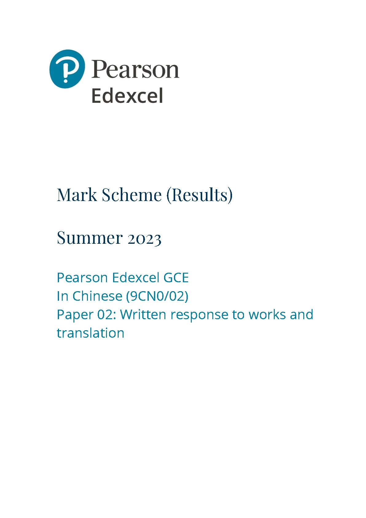 PEARSON EDEXCEL A LEVEL Chinese PAPER 2 2023 MARK SCHEME (9CN0/02: Written response to works and translation). PEARSON EDEXCEL A LEVEL Chinese PAPER 2 2023 MARK SCHEME (9CN0/02: Written response to works and translation) Pearson Edexcel A and AS Papers and Mark Schemes