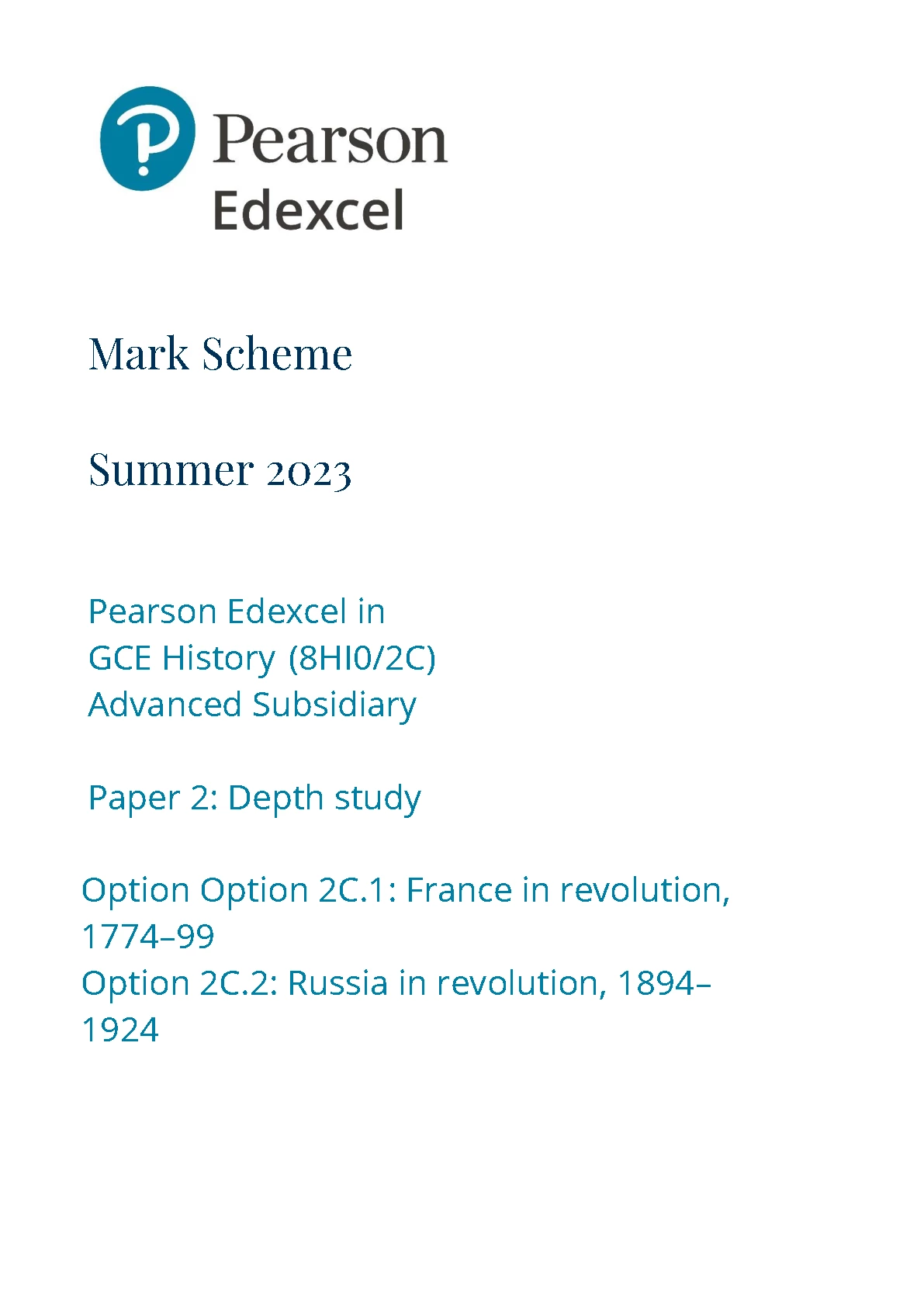PEARSON EDEXCEL AS LEVEL History PAPER 2 2023 MARK SCHEME (8HI0/2C: Option 2C.1: France in revolution, 1774–99 & Option 2C.2: Russia in revolution, 1894–1924). PEARSON EDEXCEL AS LEVEL History PAPER 2 2023 MARK SCHEME (8HI0/2C: Option 2C.1: France in revolution, 1774–99 & Option 2C.2: Russia in revolution, 1894–1924) Pearson Edexcel A and AS Papers and Mark Schemes