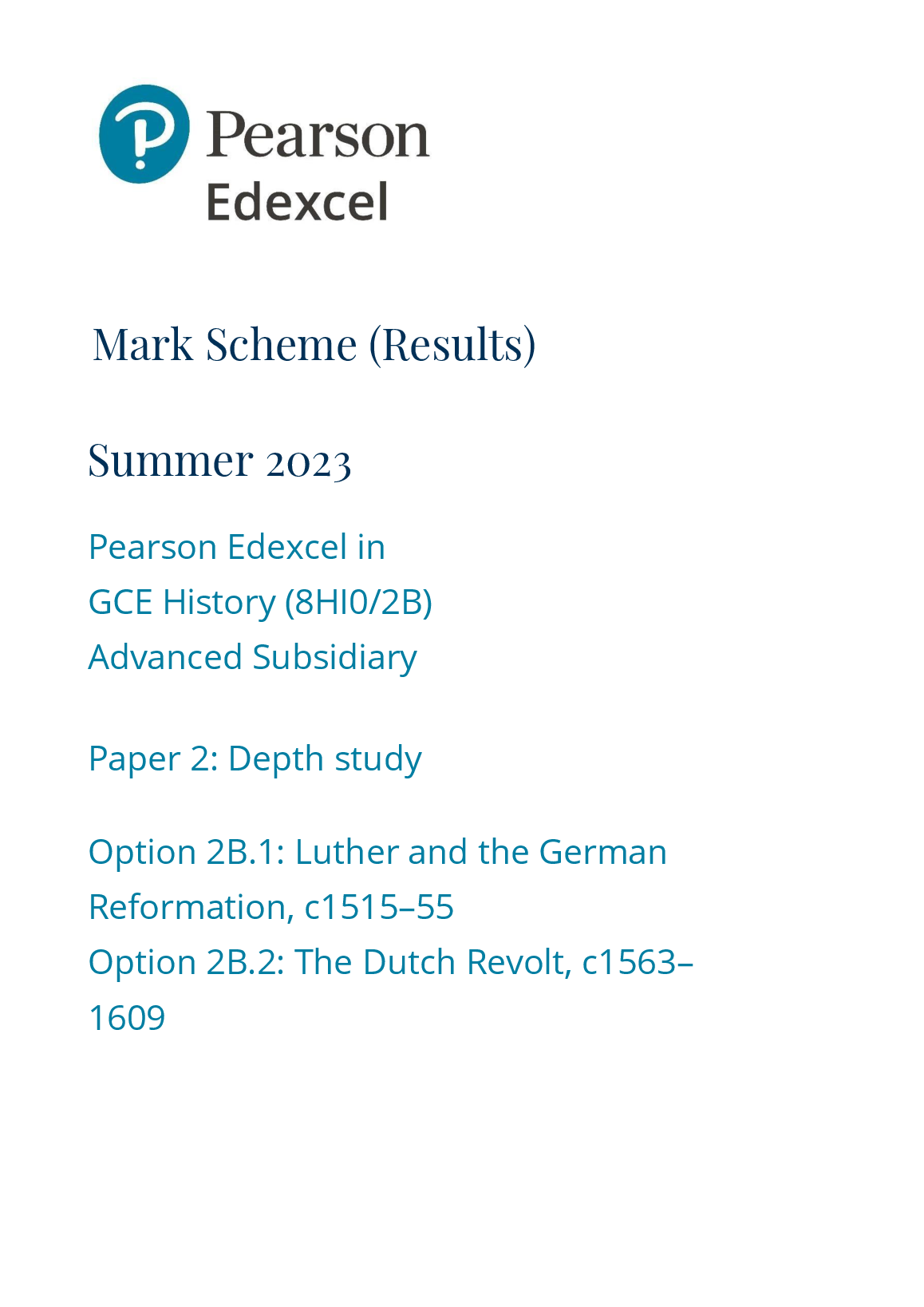 PEARSON EDEXCEL AS LEVEL History PAPER 2 2023 MARK SCHEME (8HI0/2B:Option Option 2B.1: Luther and the German Reformation, c1515–55 & Option 2B.2: The Dutch Revolt, c1563–1609). PEARSON EDEXCEL AS LEVEL History PAPER 2 2023 MARK SCHEME (8HI0/2B:Option Option 2B.1: Luther and the German Reformation, c1515–55 & Option 2B.2: The Dutch Revolt, c1563–1609) Pearson Edexcel A and AS Papers and Mark Schemes