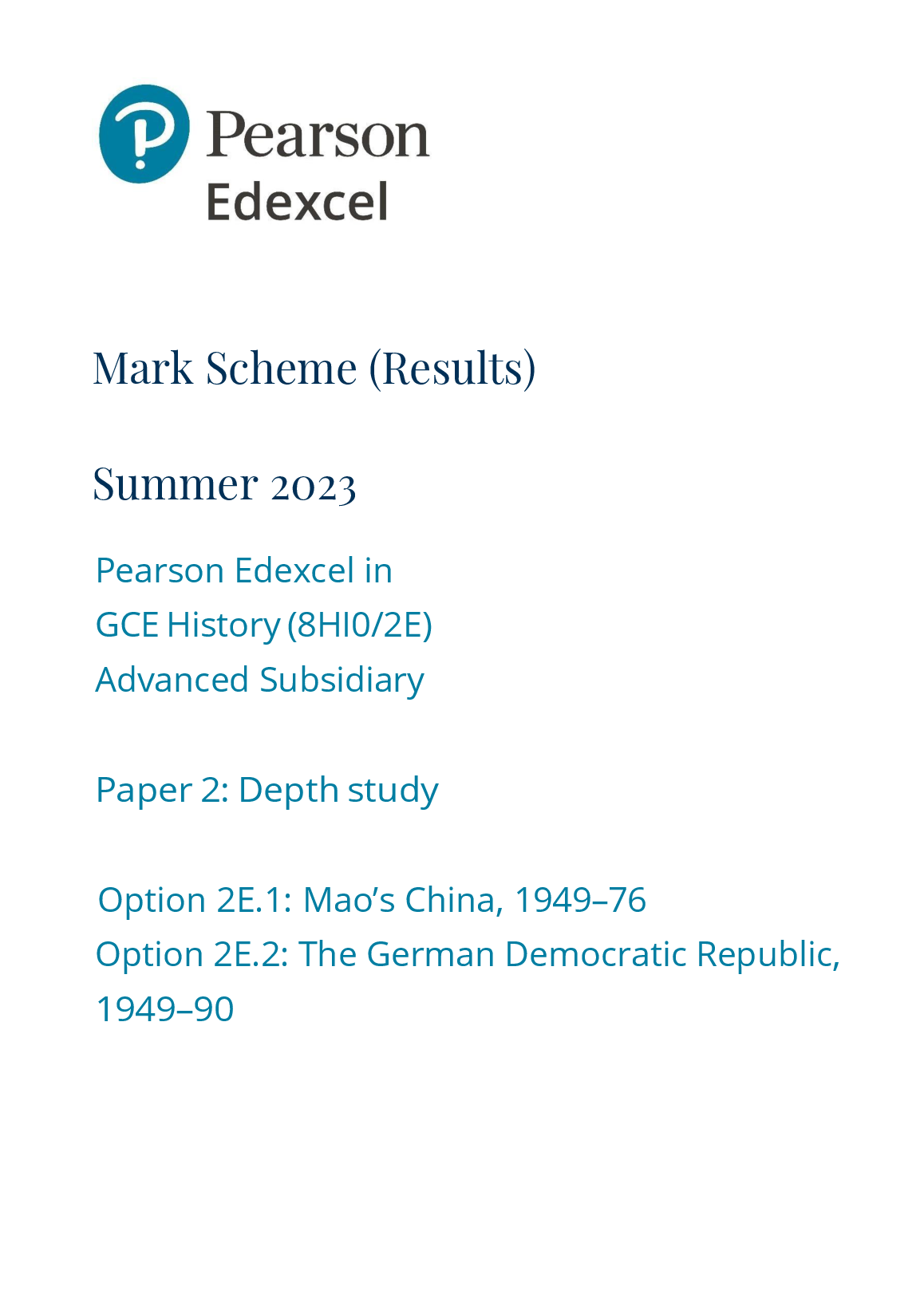 PEARSON EDEXCEL AS LEVEL History PAPER 2 2023 MARK SCHEME (8HI0/2E: Option 2E.1: Mao’s China, 1949–76 & Option 2E.2: The German Democratic Republic,1949–90). PEARSON EDEXCEL AS LEVEL History PAPER 2 2023 MARK SCHEME (8HI0/2E: Option 2E.1: Mao’s China, 1949–76 & Option 2E.2: The German Democratic Republic,1949–90) Pearson Edexcel A and AS Papers and Mark Schemes