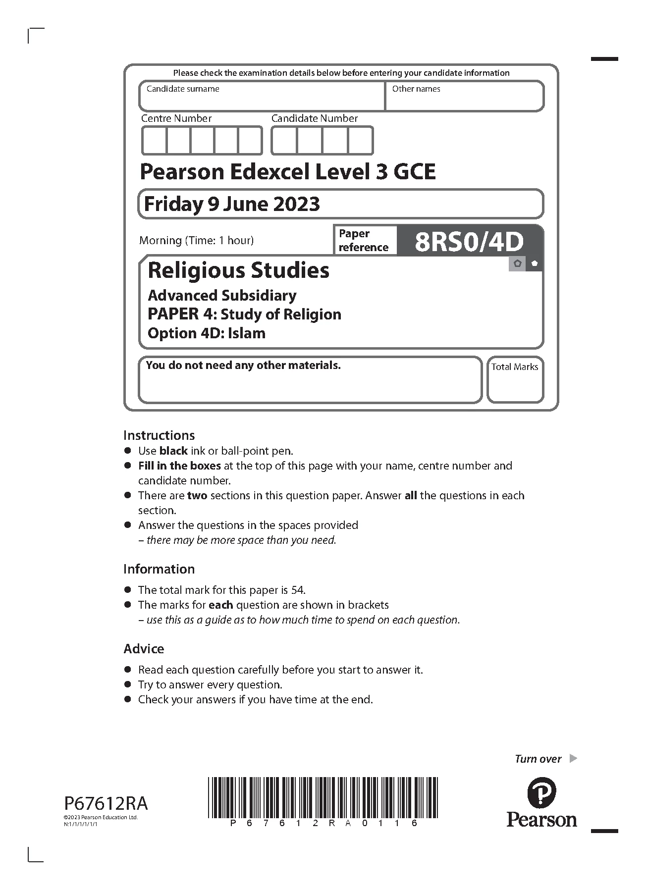 PEARSON EDEXCEL AS LEVEL Religious Studies PAPER 4 2023 QUESTION PAPER (8RS0/4D: Study of Religion - Islam). PEARSON EDEXCEL AS LEVEL Religious Studies PAPER 4 2023 QUESTION PAPER (8RS0/4D: Study of Religion - Islam) Pearson Edexcel A and AS Papers and Mark Schemes