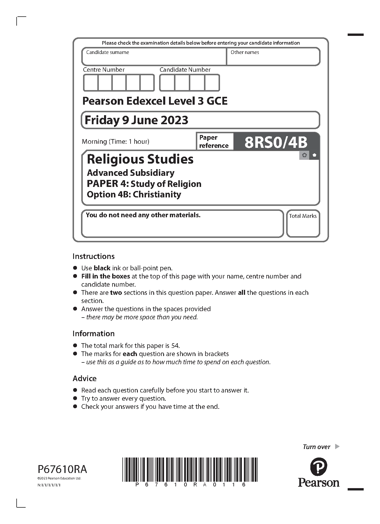 PEARSON EDEXCEL AS LEVEL Religious Studies PAPER 4 2023 QUESTION PAPER (8RS0/4B: Study of Religion - Christianity). PEARSON EDEXCEL AS LEVEL Religious Studies PAPER 4 2023 QUESTION PAPER (8RS0/4B: Study of Religion - Christianity) Pearson Edexcel A and AS Papers and Mark Schemes