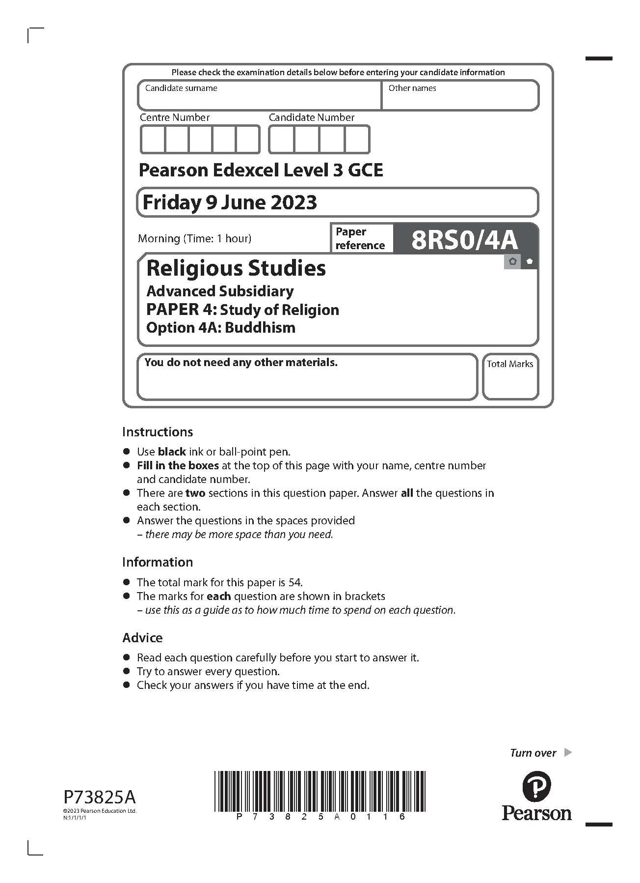PEARSON EDEXCEL AS LEVEL Religious Studies PAPER 4 2023 QUESTION PAPER (8RS0/4A: Study of Religion - Buddhism). PEARSON EDEXCEL AS LEVEL Religious Studies PAPER 4 2023 QUESTION PAPER (8RS0/4A: Study of Religion - Buddhism) Pearson Edexcel A and AS Papers and Mark Schemes