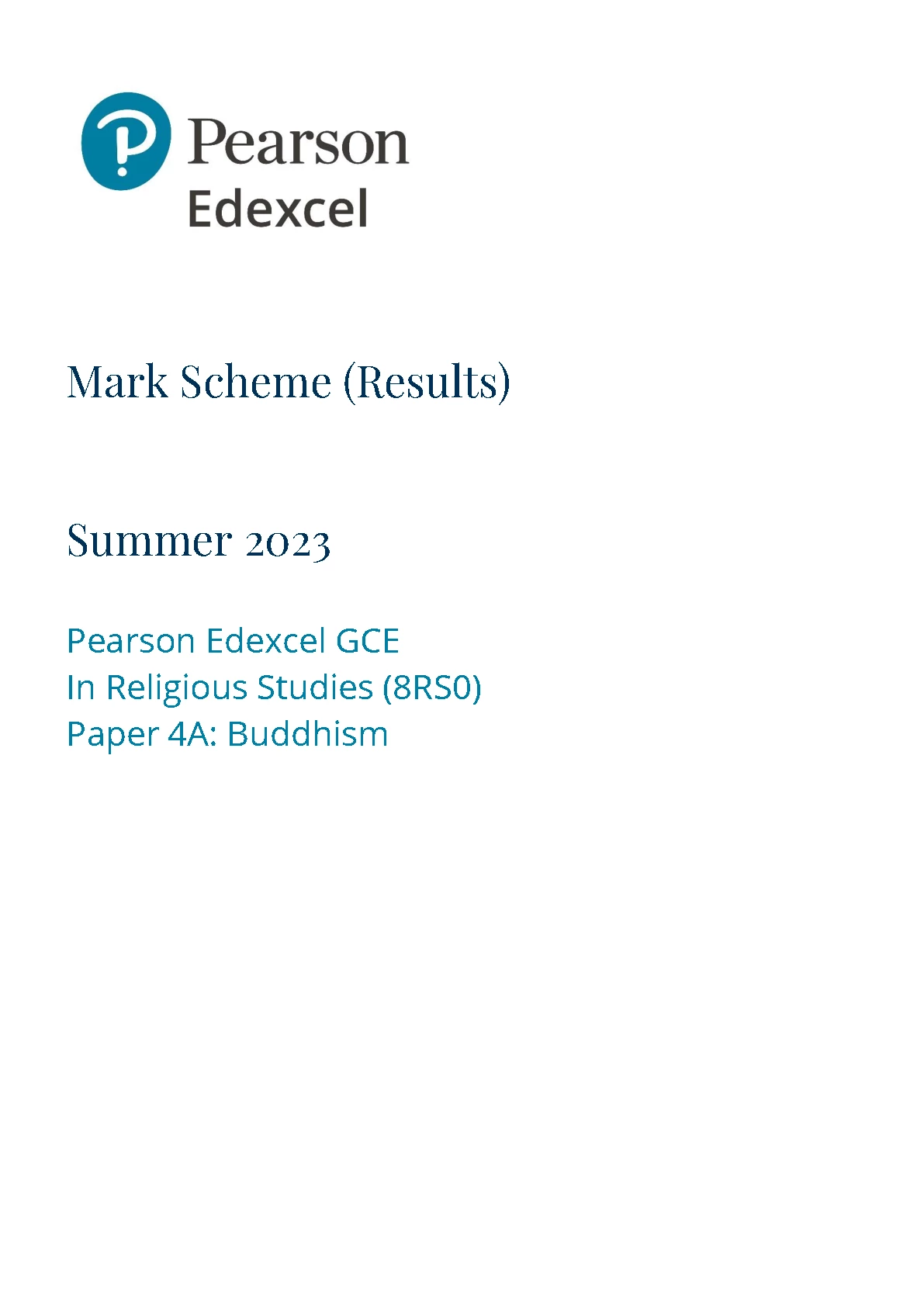 PEARSON EDEXCEL AS LEVEL Religious Studies PAPER 4 2023 MARK SCHEME (8RS0/4A: Buddhism). PEARSON EDEXCEL AS LEVEL Religious Studies PAPER 4 2023 MARK SCHEME (8RS0/4A: Buddhism) Pearson Edexcel A and AS Papers and Mark Schemes