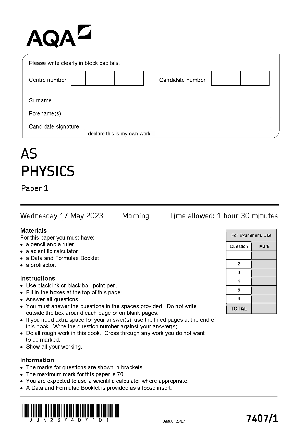 2023 aqa as physics paper 1 question paper (7407/1).