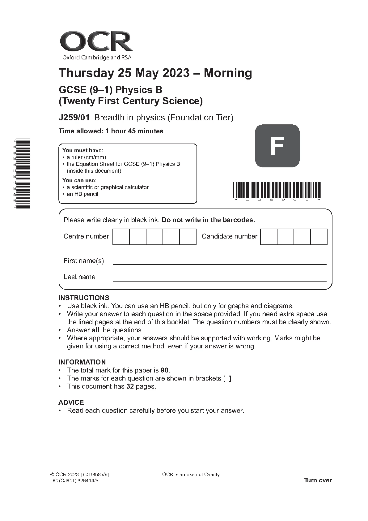 OCR GCSE PHYSICS B PAPER 1 QUESTION PAPER 2023 (J259/01: Breadth in physics (Foundation Tier)). OCR GCSE PHYSICS B PAPER 1 QUESTION PAPER 2023 (J259/01: Breadth in physics (Foundation Tier)) OCR GCSE Question Papers and Mark Schemes