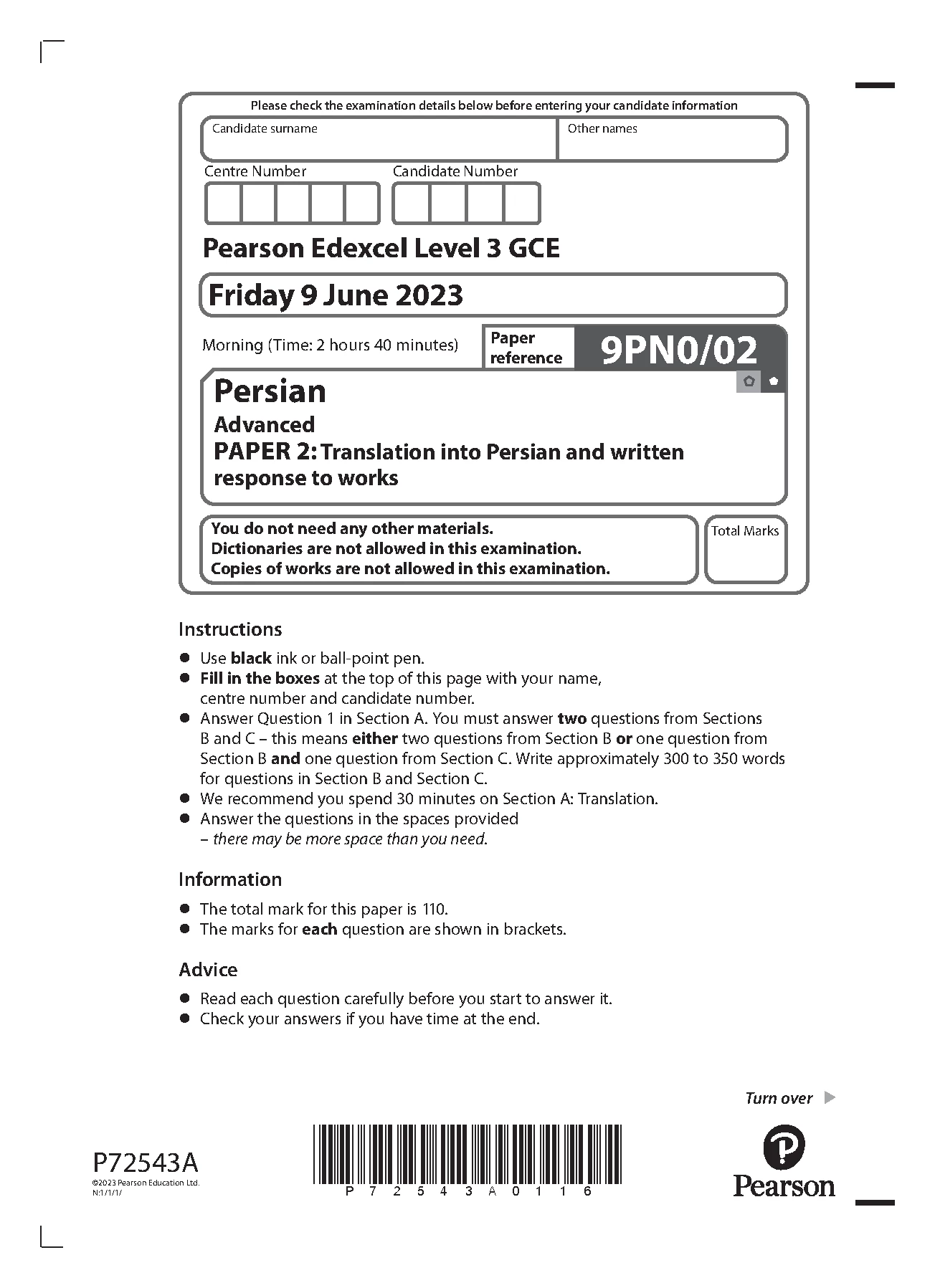 PEARSON EDEXCEL A LEVEL Persian PAPER 2 2023 QUESTION PAPER (9PN0/02: Translation into Persian and written response to works). PEARSON EDEXCEL A LEVEL Persian PAPER 2 2023 QUESTION PAPER (9PN0/02: Translation into Persian and written response to works) Pearson Edexcel A and AS Papers and Mark Schemes