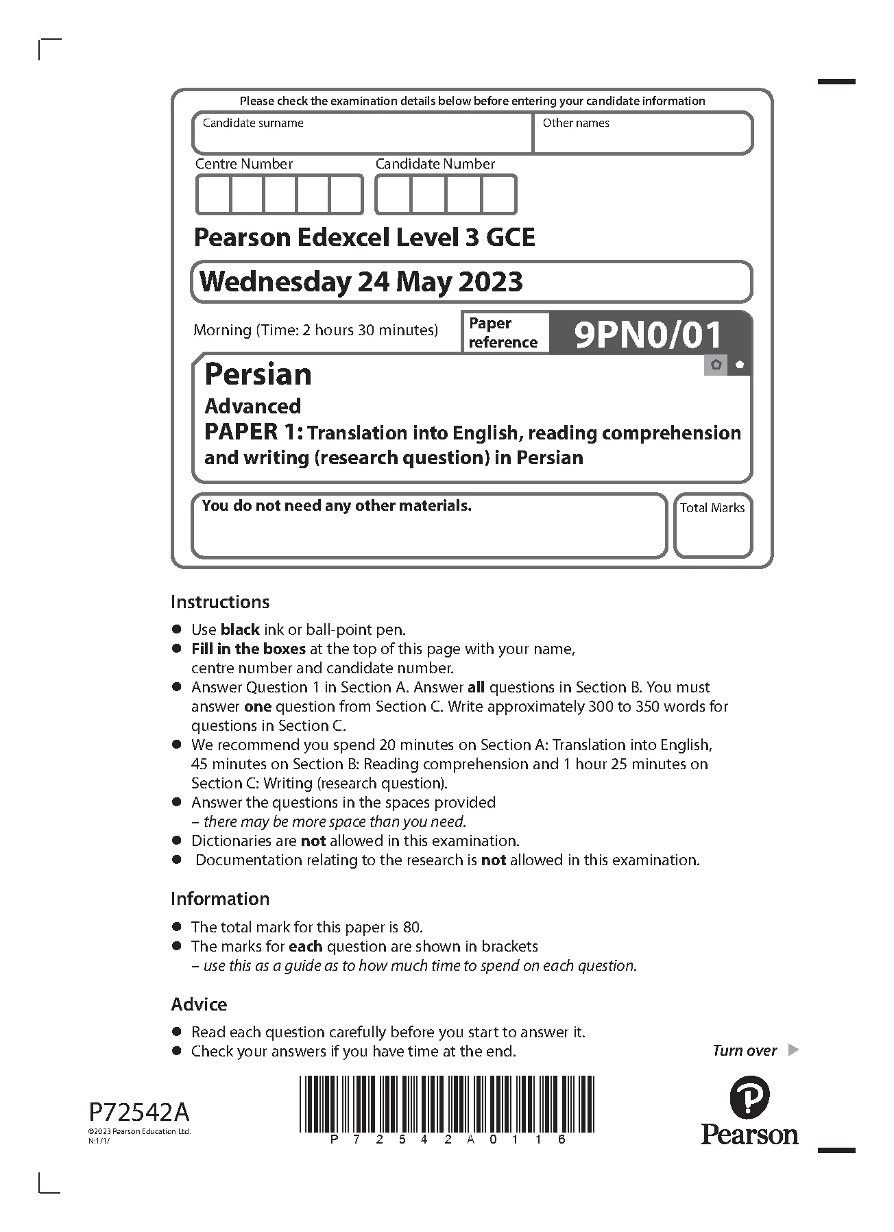PEARSON EDEXCEL A LEVEL Persian PAPER 1 2023 QUESTION PAPER (9PN0/01: Translation into English, reading comprehension and writing (research question) in Persian). PEARSON EDEXCEL A LEVEL Persian PAPER 1 2023 QUESTION PAPER (9PN0/01: Translation into English, reading comprehension and writing (research question) in Persian) Pearson Edexcel A and AS Papers and Mark Schemes