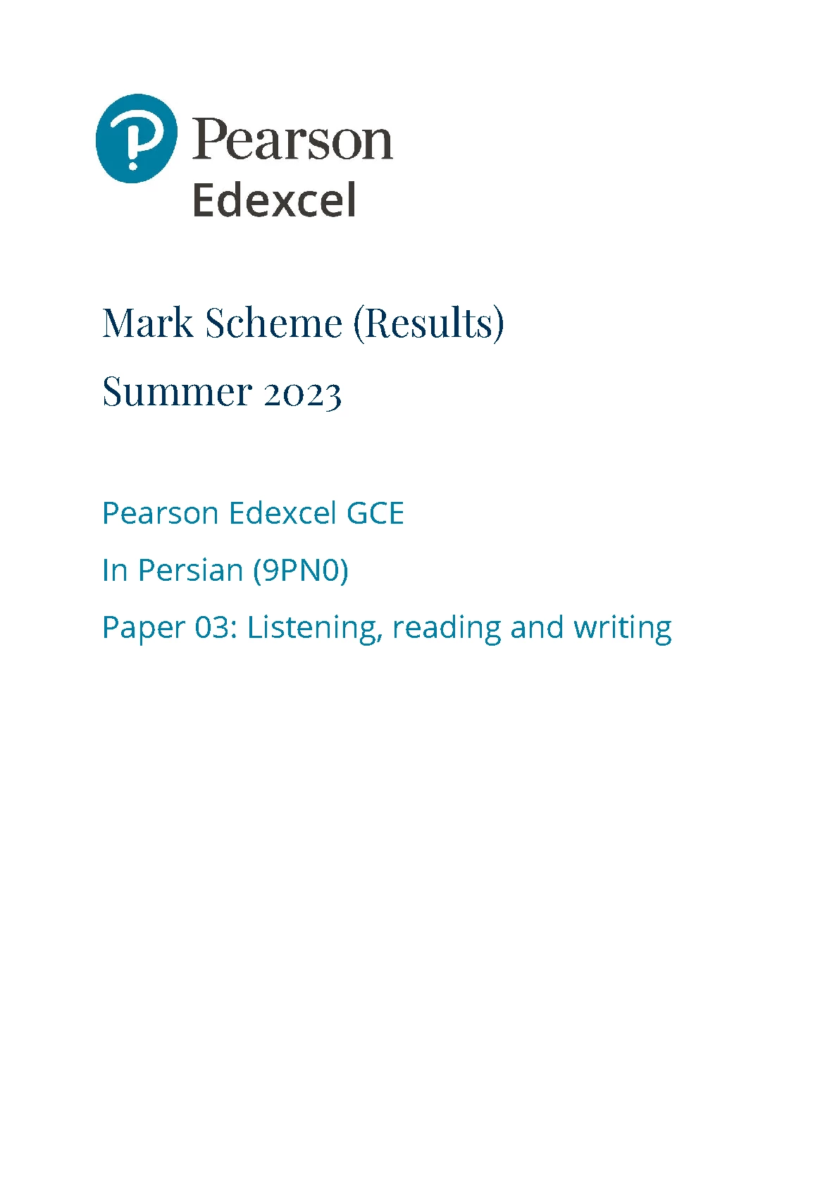 Pearson Edexcel GCE In Persian (9PN0) Paper 03: Listening, reading and writing MARK SCHEME 2023. Pearson Edexcel GCE In Persian (9PN0) Paper 03: Listening, reading and writing MARK SCHEME 2023 Pearson Edexcel A and AS Papers and Mark Schemes