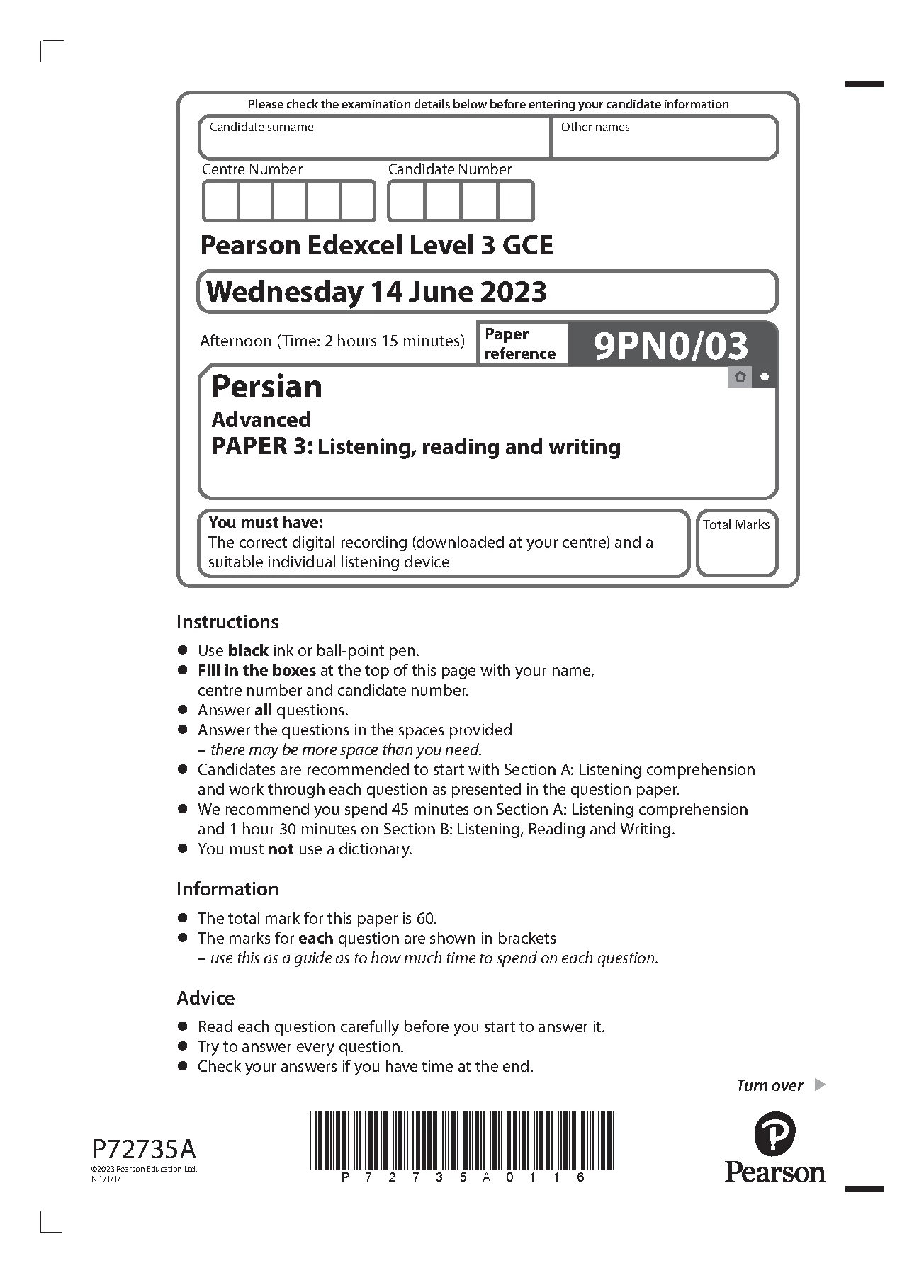 PEARSON EDEXCEL A LEVEL Persian PAPER 3 2023 QUESTION PAPER (9PN0/03: Listening, reading and writing). PEARSON EDEXCEL A LEVEL Persian PAPER 3 2023 QUESTION PAPER (9PN0/03: Listening, reading and writing) Pearson Edexcel A and AS Papers and Mark Schemes