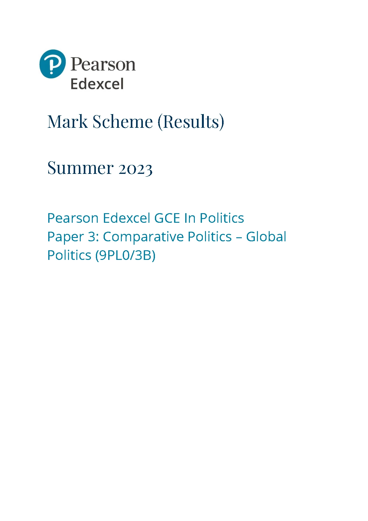 PEARSON EDEXCEL A LEVEL Politics PAPER 3 2023 MARK SCHEME (9PL0/3B: Comparative Politics – Global Politics). PEARSON EDEXCEL A LEVEL Politics PAPER 3 2023 MARK SCHEME (9PL0/3B: Comparative Politics – Global Politics) Pearson Edexcel A and AS Papers and Mark Schemes