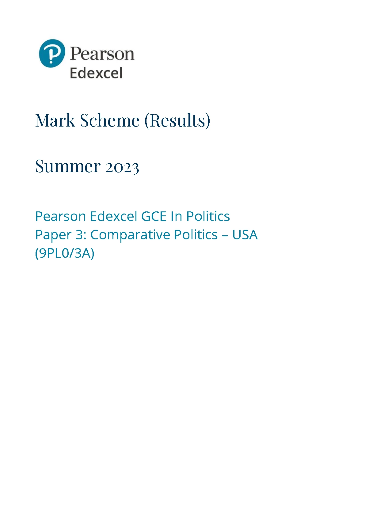 PEARSON EDEXCEL A LEVEL Politics PAPER 3 2023 MARK SCHEME (9PL0/3A: Comparative Politics – USA). PEARSON EDEXCEL A LEVEL Politics PAPER 3 2023 MARK SCHEME (9PL0/3A: Comparative Politics – USA) Pearson Edexcel A and AS Papers and Mark Schemes