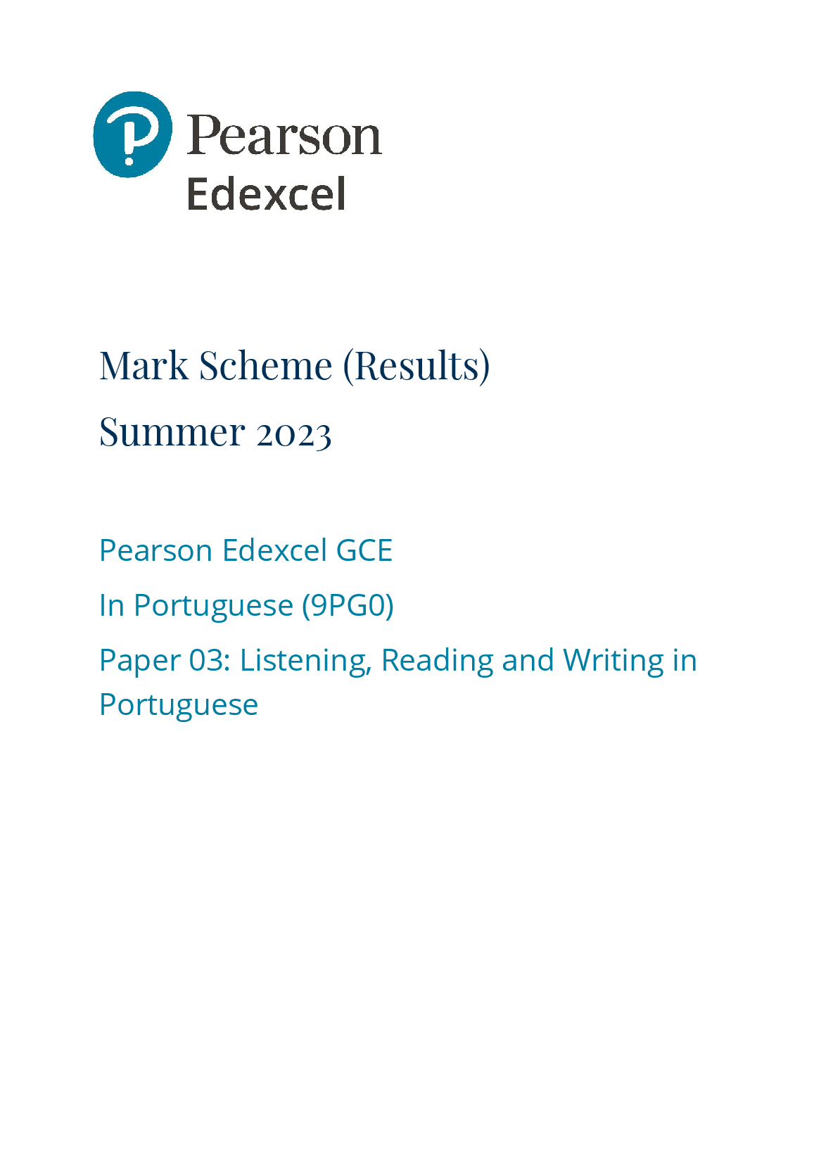 PEARSON EDEXCEL A LEVEL Portuguese PAPER 3 2023 MARK SCHEME (9PG0/03: Listening, Reading and Writing in Portuguese). PEARSON EDEXCEL A LEVEL Portuguese PAPER 3 2023 MARK SCHEME (9PG0/03: Listening, Reading and Writing in Portuguese) Pearson Edexcel A and AS Papers and Mark Schemes