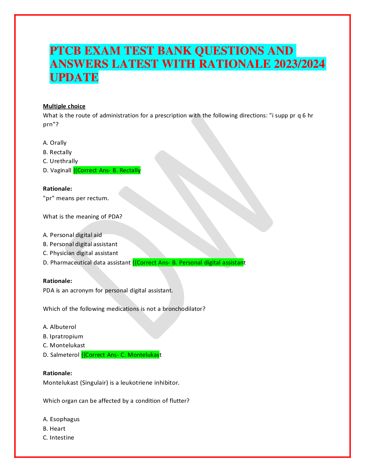 PTCB EXAM TEST BANK QUESTIONS AND ANSWERS LATEST WITH RATIONALE 2024 UPDATE. PTCB EXAM TEST BANK QUESTIONS AND ANSWERS LATEST WITH RATIONALE 2024 UPDATE TEST BANK