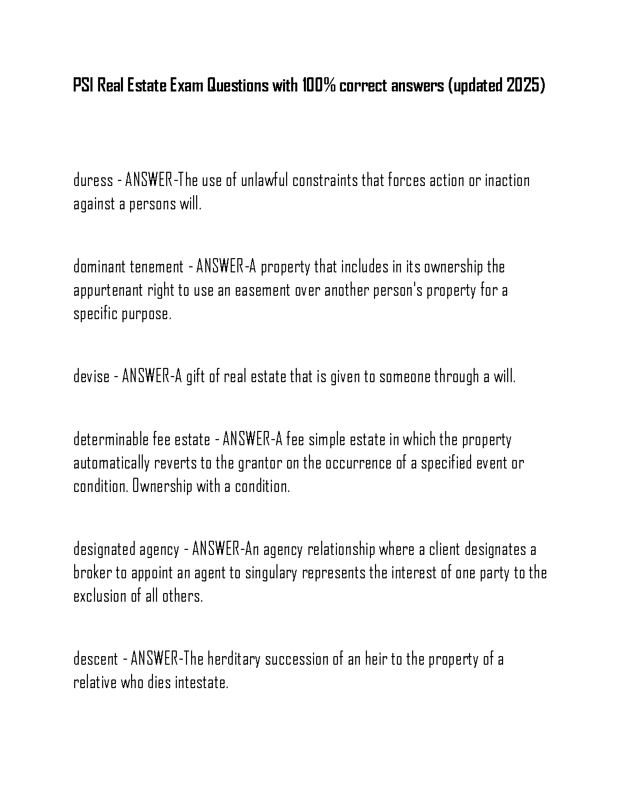 ace your psi real estate exam with this comprehensive guide featuring 100% accurate answers to all exam questions. updat...
