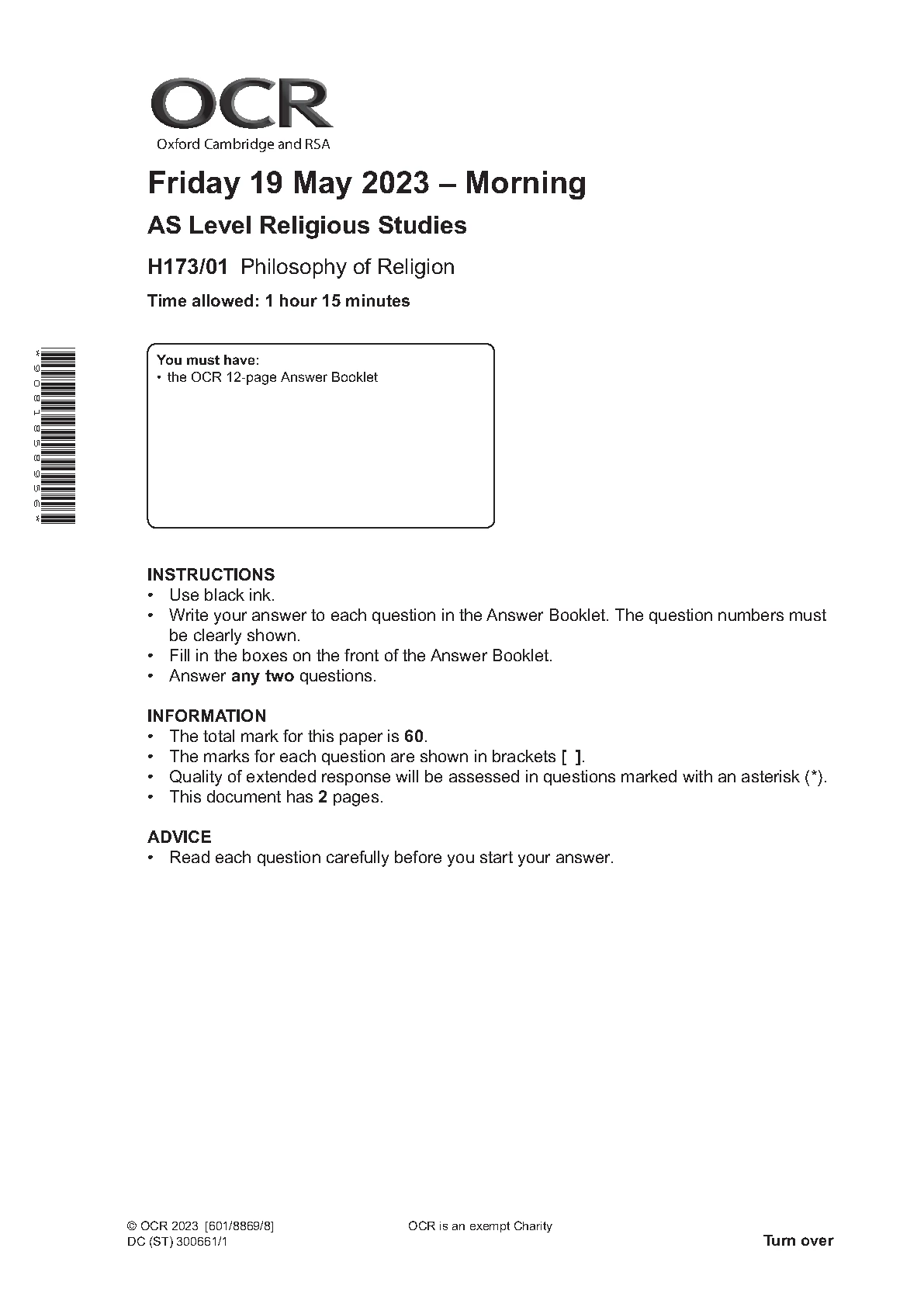 OCR GCE AS LEVEL RELIGIOUS STUDIES PAPER 1 QUESTION PAPER 2023 (H173/01: Philosophy of Religion). OCR GCE AS LEVEL RELIGIOUS STUDIES PAPER 1 QUESTION PAPER 2023 (H173/01: Philosophy of Religion) OCR GCE A & AS LEVEL Papers and Mark Schemes