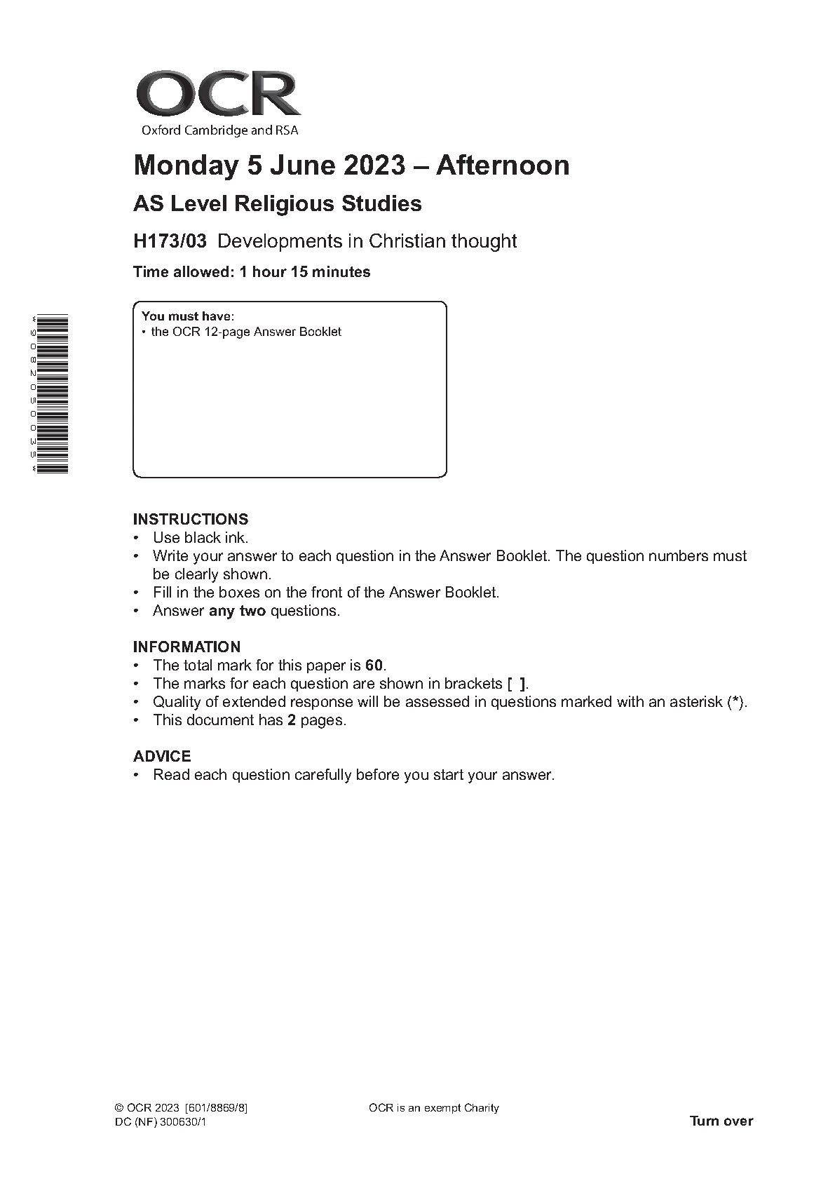 OCR GCE AS LEVEL RELIGIOUS STUDIES PAPER 3 QUESTION PAPER 2023 (H173/03: Developments in Christian thought). OCR GCE AS LEVEL RELIGIOUS STUDIES PAPER 3 QUESTION PAPER 2023 (H173/03: Developments in Christian thought) OCR GCE A & AS LEVEL Papers and Mark Schemes
