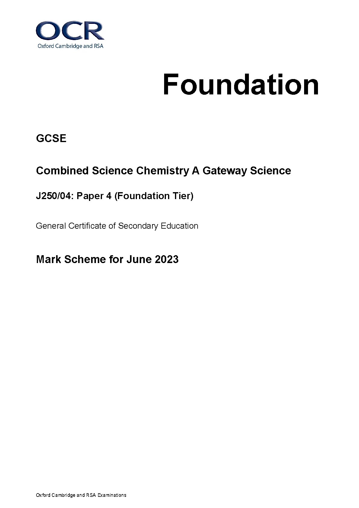 OCR GCSE Combined Science (Chemistry) A PAPER 4 MARK SCHEME 2023 (J250/04: Foundation Tier). OCR GCSE Combined Science (Chemistry) A PAPER 4 MARK SCHEME 2023 (J250/04: Foundation Tier) OCR GCSE Question Papers and Mark Schemes