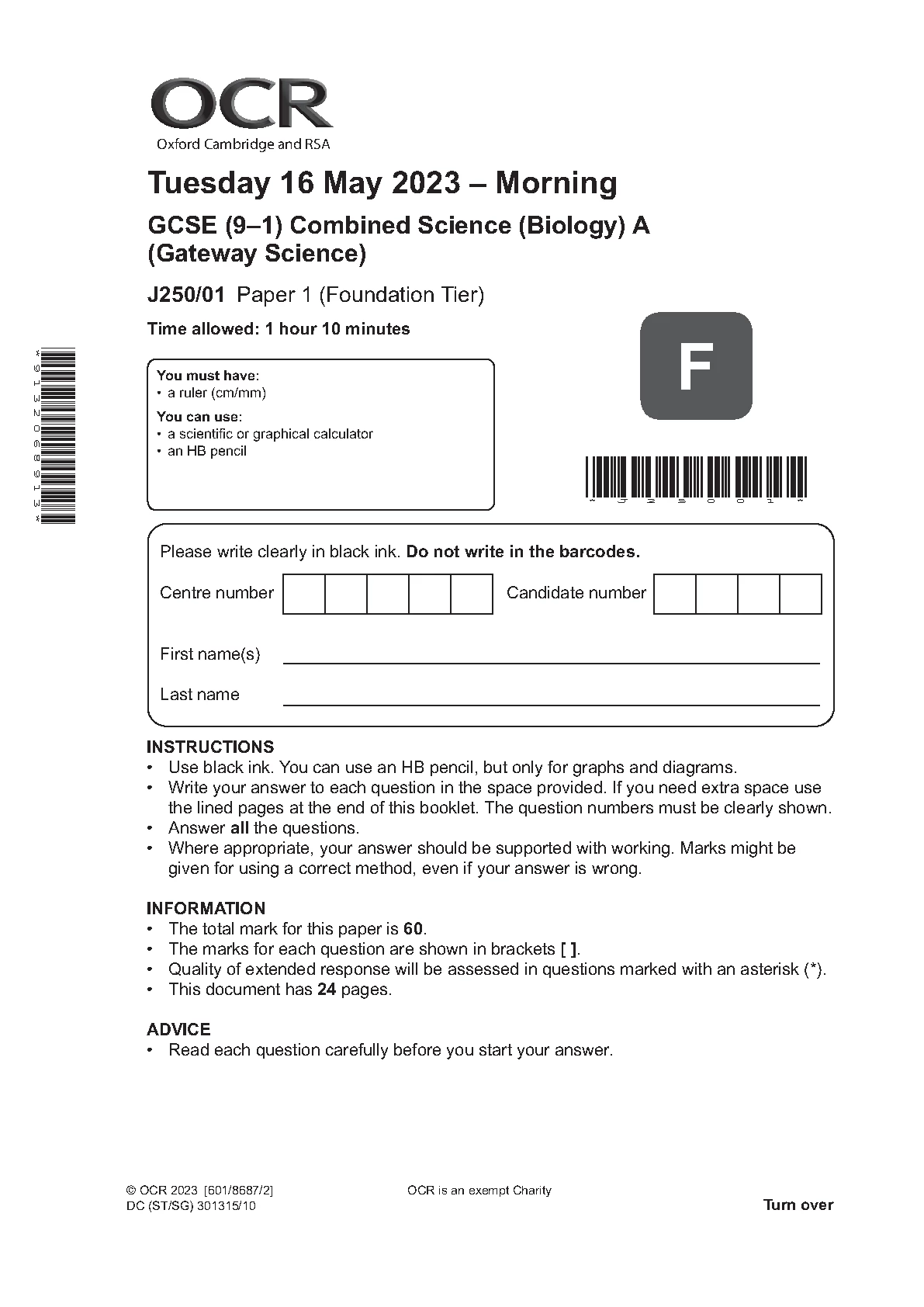 OCR GCSE Combined Science (Biology) A PAPER 1 QUESTION PAPER 2023 (J250/01: Foundation Tier). OCR GCSE Combined Science (Biology) A PAPER 1 QUESTION PAPER 2023 (J250/01: Foundation Tier) OCR GCSE Question Papers and Mark Schemes