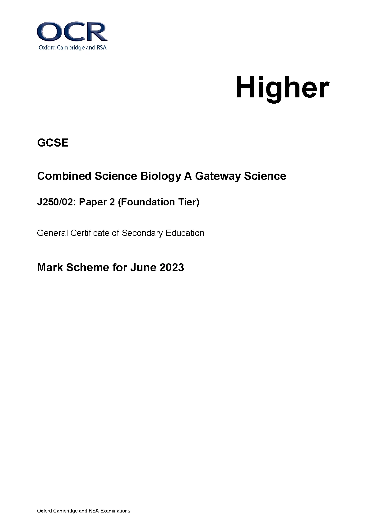 OCR GCSE Combined Science (Biology) A PAPER 2 MARK SCHEME 2023 (J250/02: Foundation Tier). OCR GCSE Combined Science (Biology) A PAPER 2 MARK SCHEME 2023 (J250/02: Foundation Tier) OCR GCSE Question Papers and Mark Schemes
