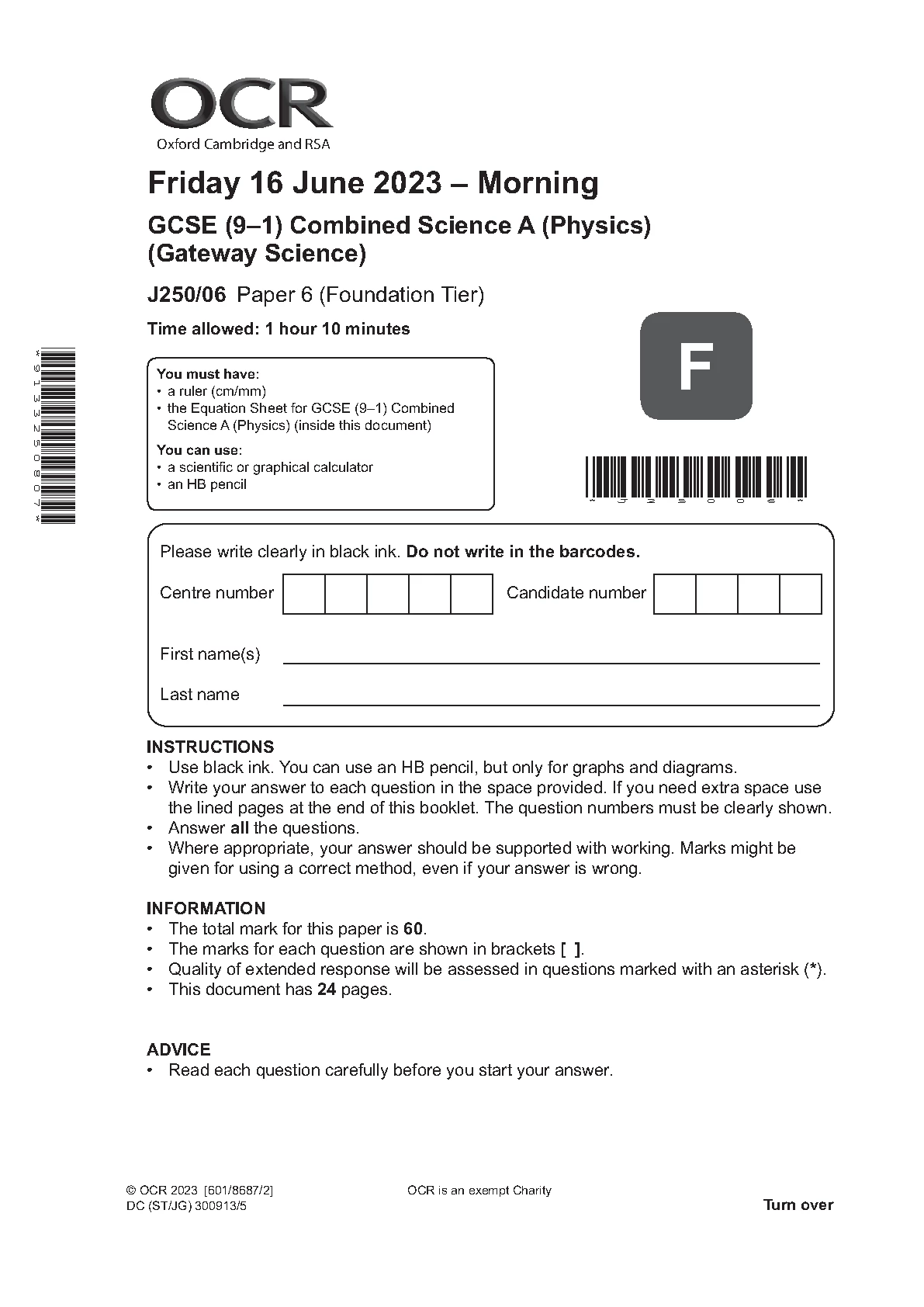 OCR GCSE Combined Science (Physics) A PAPER 6 QUESTION PAPER 2023 (J250/06: Foundation Tier). OCR GCSE Combined Science (Physics) A PAPER 6 QUESTION PAPER 2023 (J250/06: Foundation Tier) OCR GCSE Question Papers and Mark Schemes