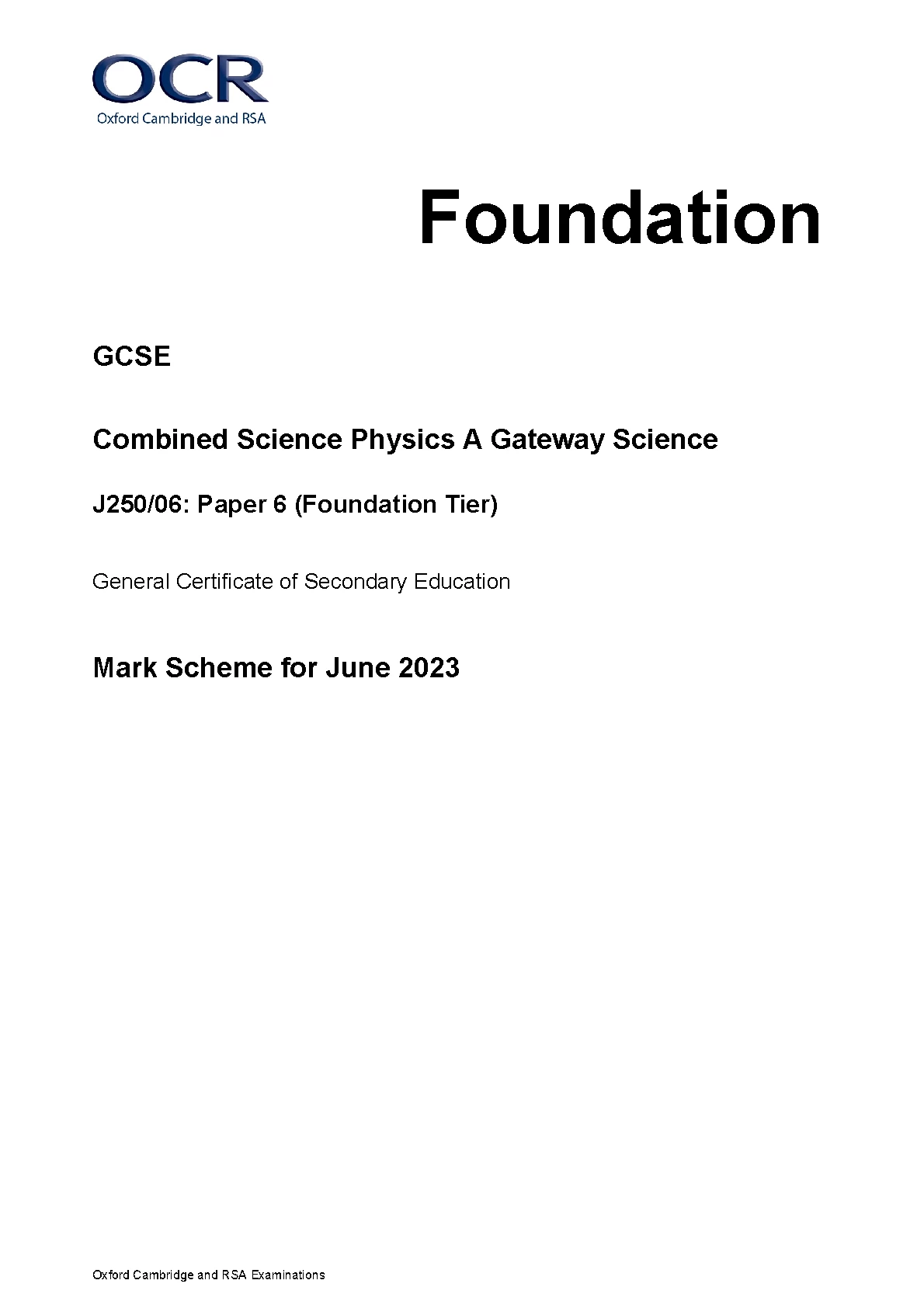 OCR GCSE Combined Science (Physics) A PAPER 6 MARK SCHEME 2023 (J250/06: Foundation Tier). OCR GCSE Combined Science (Physics) A PAPER 6 MARK SCHEME 2023 (J250/06: Foundation Tier) OCR GCSE Question Papers and Mark Schemes