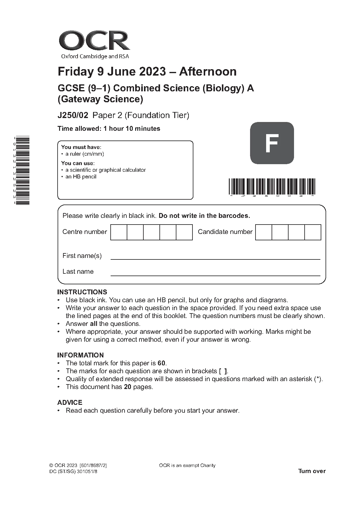 OCR GCSE Combined Science (Biology) A PAPER 2 QUESTION PAPER 2023 (J250/02: Foundation Tier). OCR GCSE Combined Science (Biology) A PAPER 2 QUESTION PAPER 2023 (J250/02: Foundation Tier) OCR GCSE Question Papers and Mark Schemes