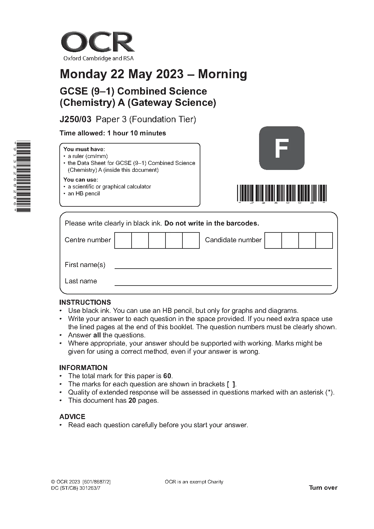 OCR GCSE Combined Science (Chemistry) A PAPER 3 QUESTION PAPER 2023 (J250/03: Foundation Tier). OCR GCSE Combined Science (Chemistry) A PAPER 3 QUESTION PAPER 2023 (J250/03: Foundation Tier) OCR GCSE Question Papers and Mark Schemes