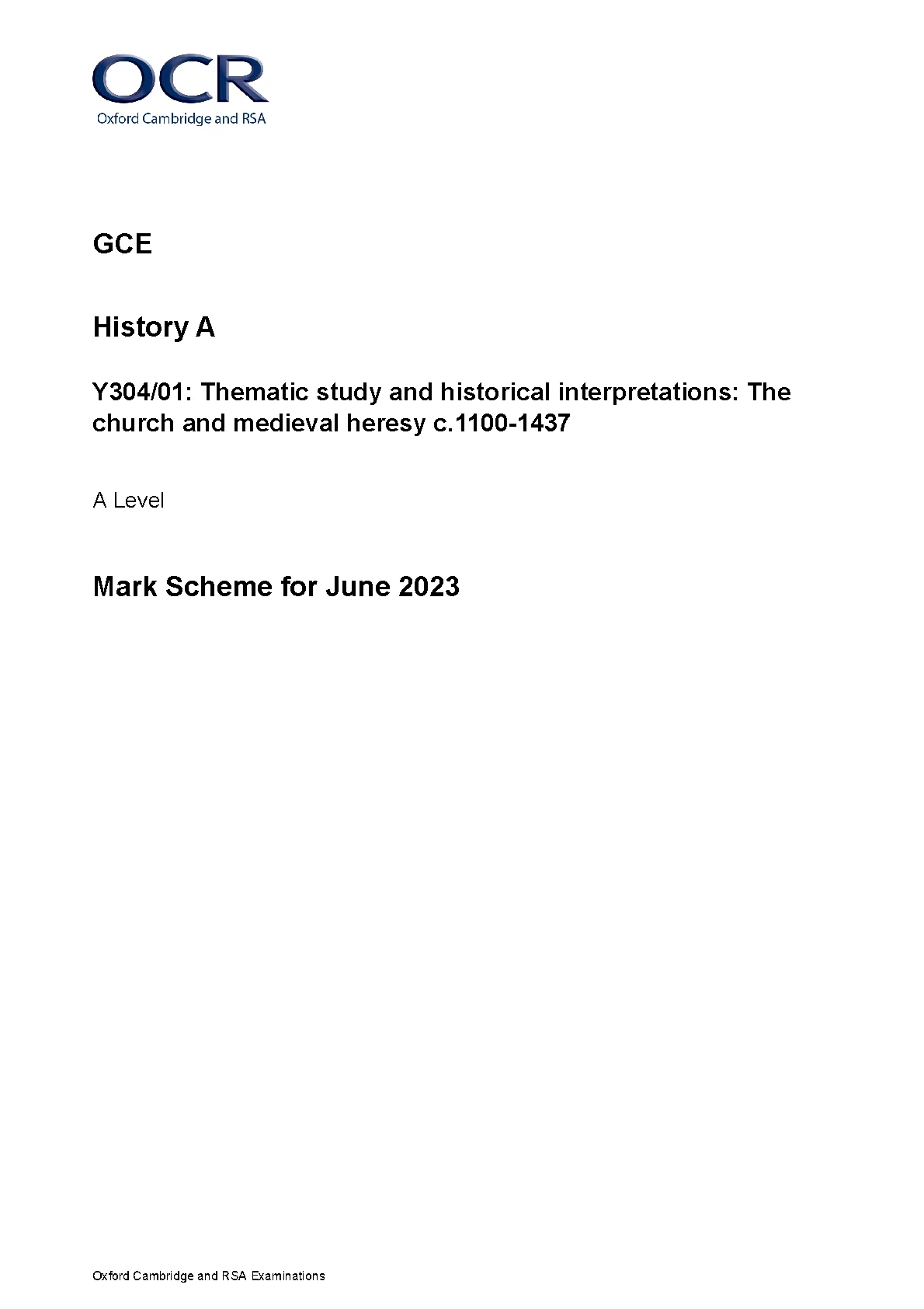 OCR GCE A LEVEL HISTORY A PAPER 1 MARK SCHEME 2023 (Y304/01: The Church and Medieval Heresy c.1100–1437). OCR GCE A LEVEL HISTORY A PAPER 1 MARK SCHEME 2023 (Y304/01: The Church and Medieval Heresy c.1100–1437) OCR GCE A & AS LEVEL Papers and Mark Schemes