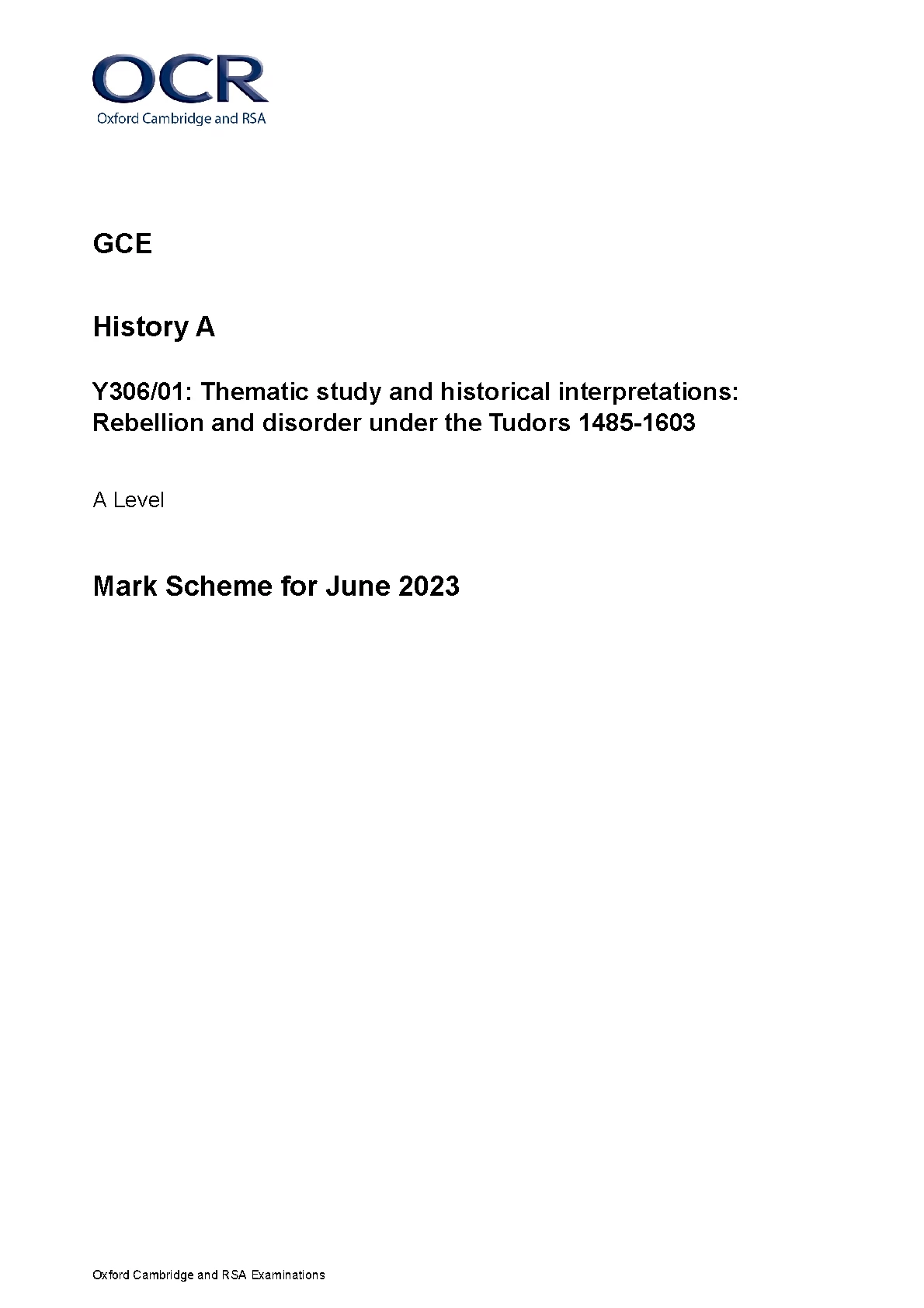 OCR GCE A LEVEL HISTORY A PAPER 1 MARK SCHEME 2023 (Y306/01: Rebellion and Disorder under the Tudors 1485–1603). OCR GCE A LEVEL HISTORY A PAPER 1 MARK SCHEME 2023 (Y306/01: Rebellion and Disorder under the Tudors 1485–1603) OCR GCE A & AS LEVEL Papers and Mark Schemes